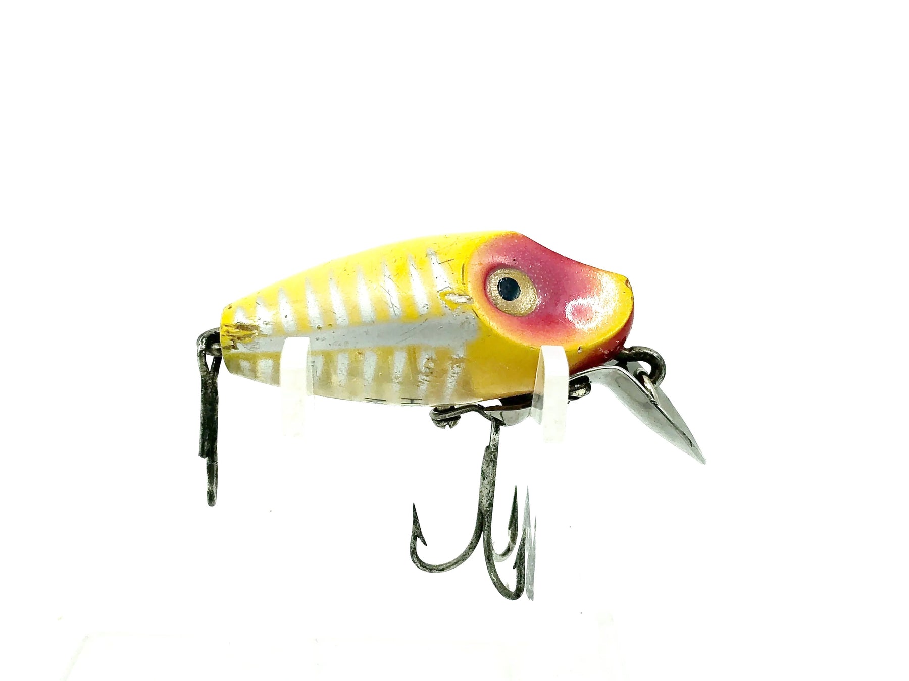 Heddon Midgit Digit River Runt Spook 9020, XRY Yellow Shore Color. About 1 5/8" long. Used lure with some minor wear and two broken barbs but still overall in ok condition. Fine for fishing or display. See photos. One of the most iconic fishing lures of all time. Collect or fish you can't go wrong with a Heddon River Runt.
