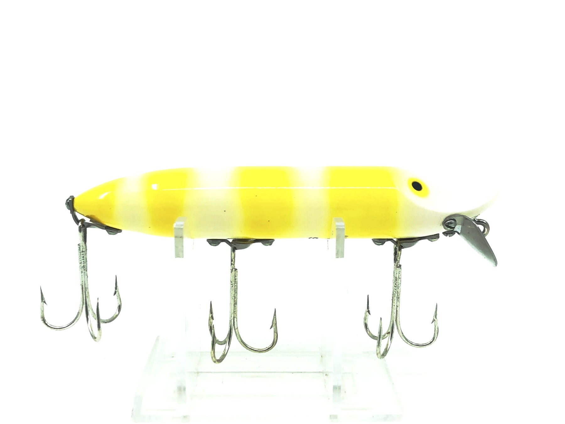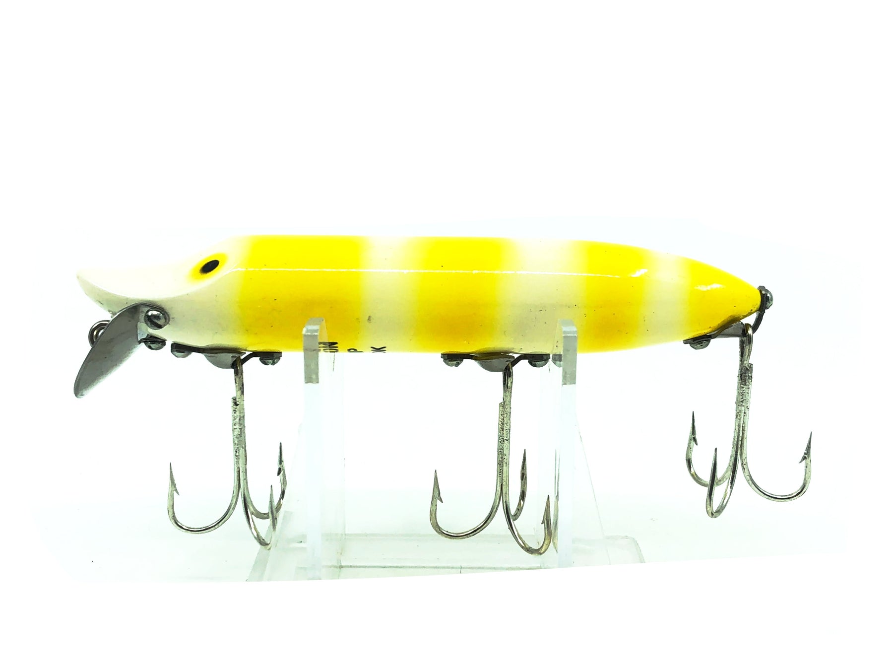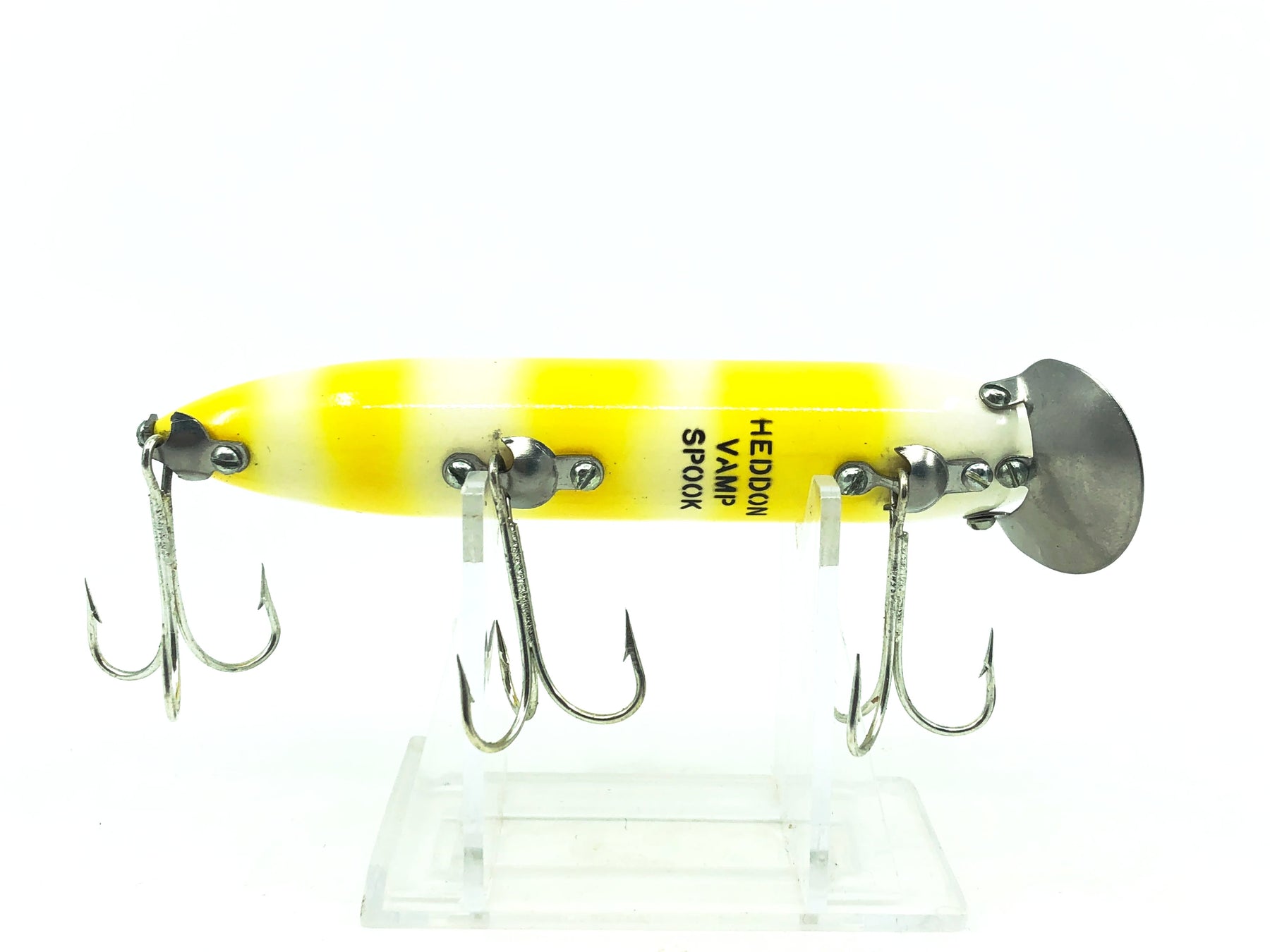 Heddon Vamp Spook, SIMA-Yellow/White Color. Tough color to find. About 4 1/4" long not including lip. Used lure with some minor wear but overall very good condition. Classic Heddon bait to fish or collect. See photos. One of the best baits ever made!