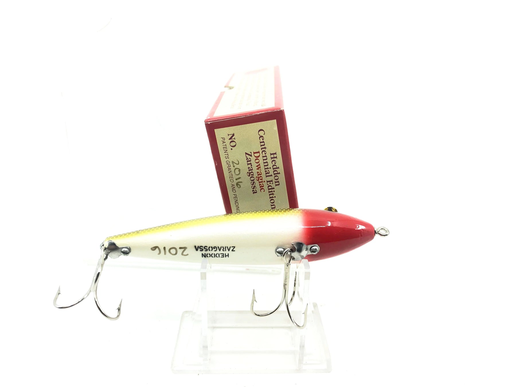 Heddon Centennial Edition Wood Zaragossa New in Box NO. X6500W-JRH - Frog Scale Red Head Numbered! Great wooden lure and box. End of box marked. Beautiful wooden lure from Heddon, part of their centennial collection comes with certificate of authenticity. Box and lure in great shape with only a little minor storage wear. See photos. Fish or collect a great Heddon lure.