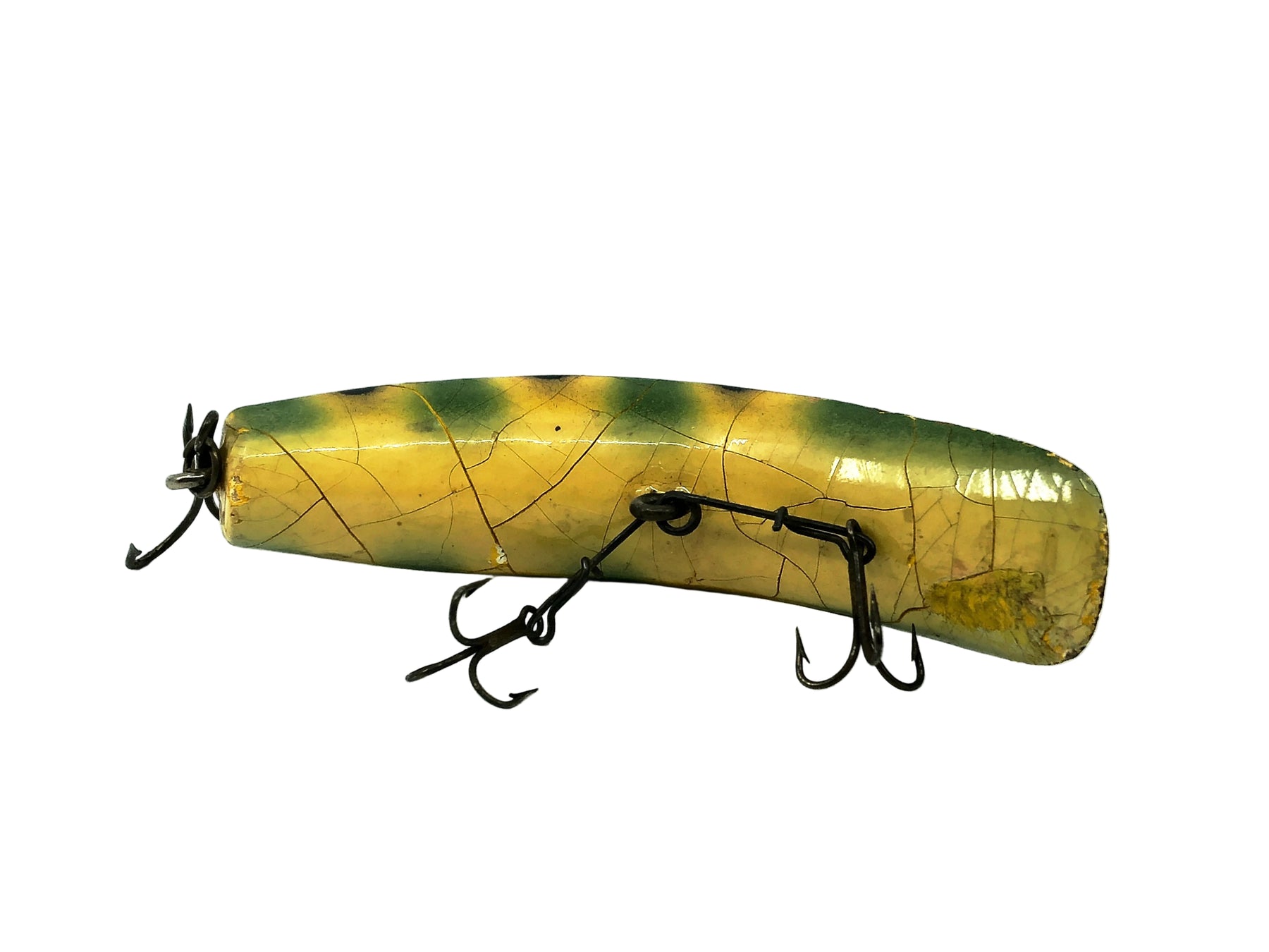 Helin Flatfish S3, Frog Color. Older wooden Flatfish. About 3 1/2" long. Used with some wear and cracks in the paint but in overall fair condition for its age, see photos. Dual Hook hanger with a single back treble hook model. One of the most successful fishing lures ever made. Fish or collect! Usually these old wooden flatfish are in much worse condition!