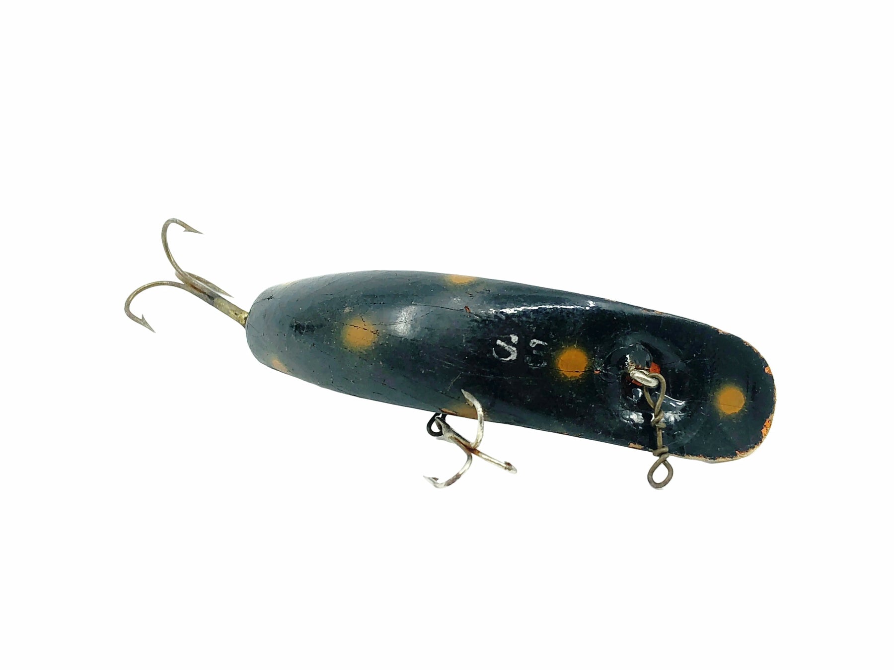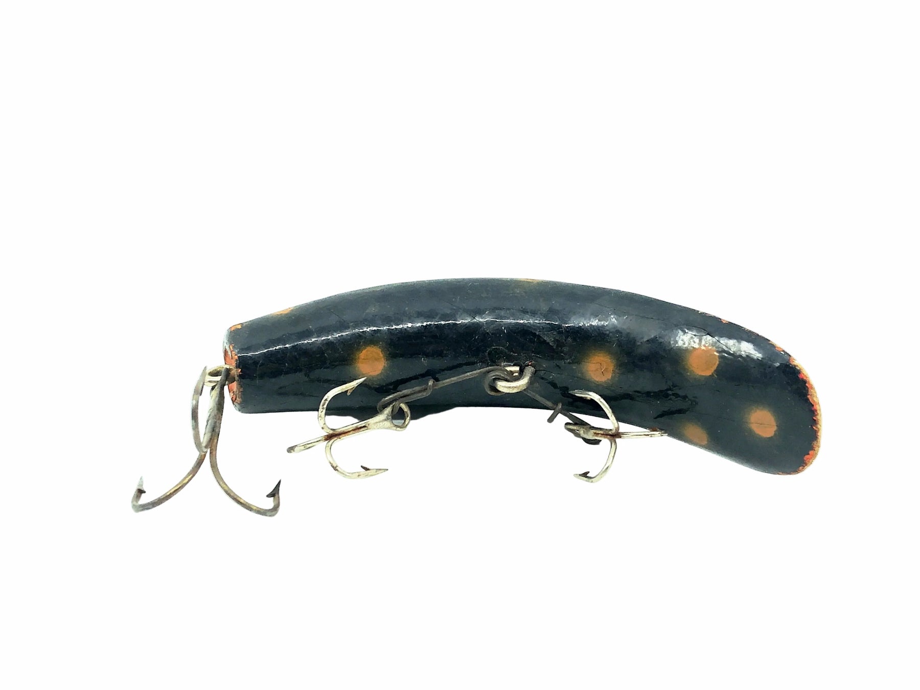 Helin Wooden Flatfish S3, BL Black w/Spots Color. About 3 3/4" long.  Used with some wear and marks but in overall good condition, see photos.  One of the most successful fishing lures ever made.  Fish or collect!  Vintage wooden version.