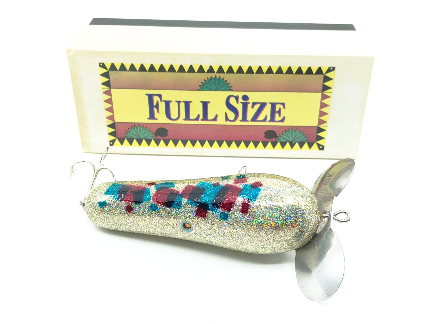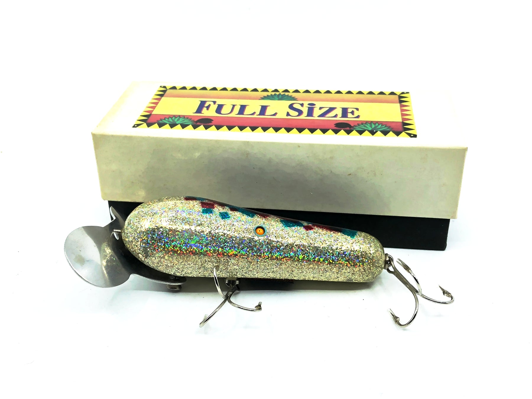 Full Size Wakebait Silver Glitter/Red & Blue Japanese Lure w/Box. I wasn't able to find much on this Japanese lure but it definitely is unique. Brass hardware and a heavy body. Lure is about 3 1/2" long. Bait is new in box and the box is in great condition. Fish or collect.