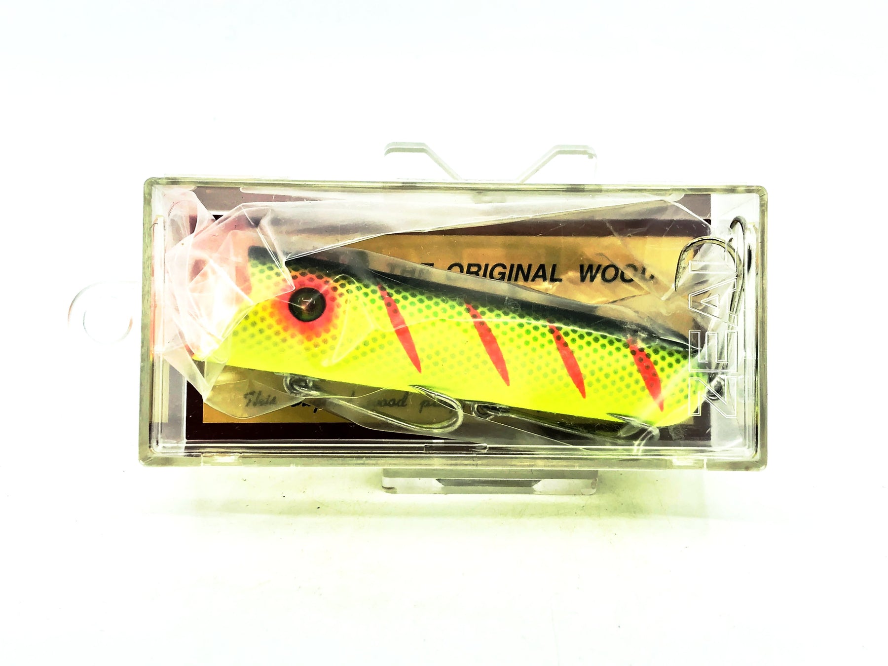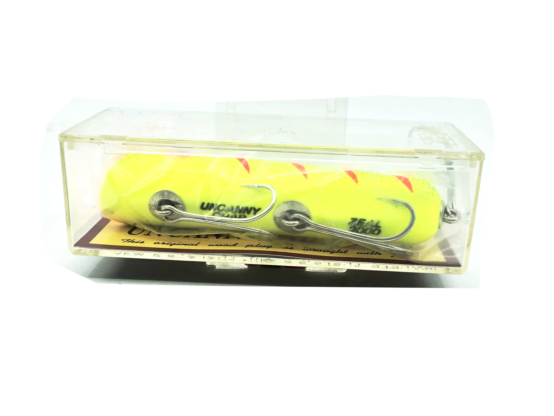 Zeal Uncanny Champ, Fluorescent Perch Color with Box. Iconic Japanese wooden lure here. This lure is about 3 1/4" long overall. Bait is new in box and the box is in very good condition, see photos. Fish or collect. Kind of like a Lucky 13.