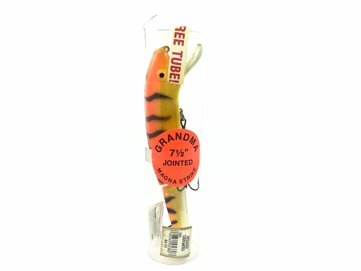 Grandma 7 1/2" Jointed Magna Strike, Orange Tiger Color w/Tube. Vintage Grandma in an uncommon box packaging. Lure is new in tube and the tube is in good condition. See photos. Great musky bait. Grab this one while you can.