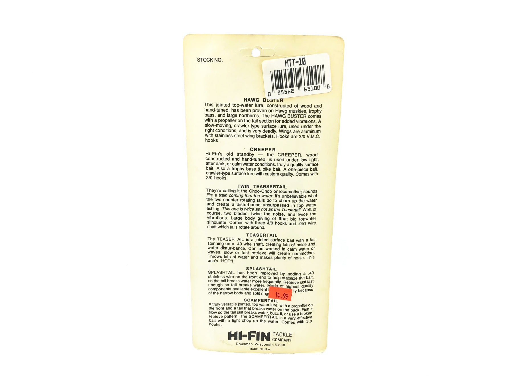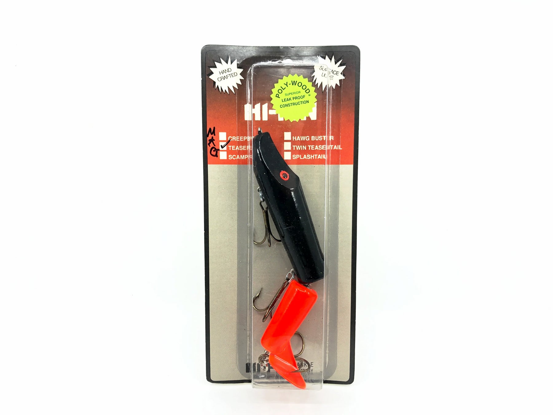 Hi-Fin Magnum Teasertail, Black/Blaze Orange Tail Color on Card. Great topwater bait. Lure body is about 7 1/2" long. This bait is new on card and the card is in great condition. See photos.