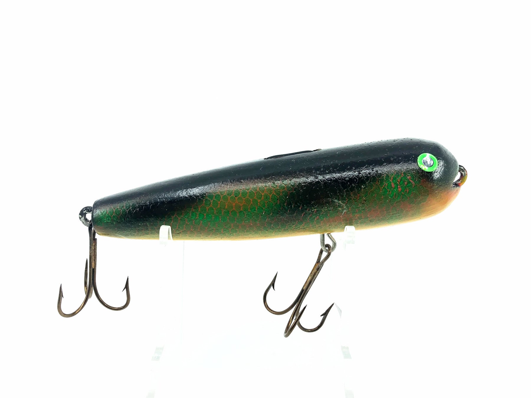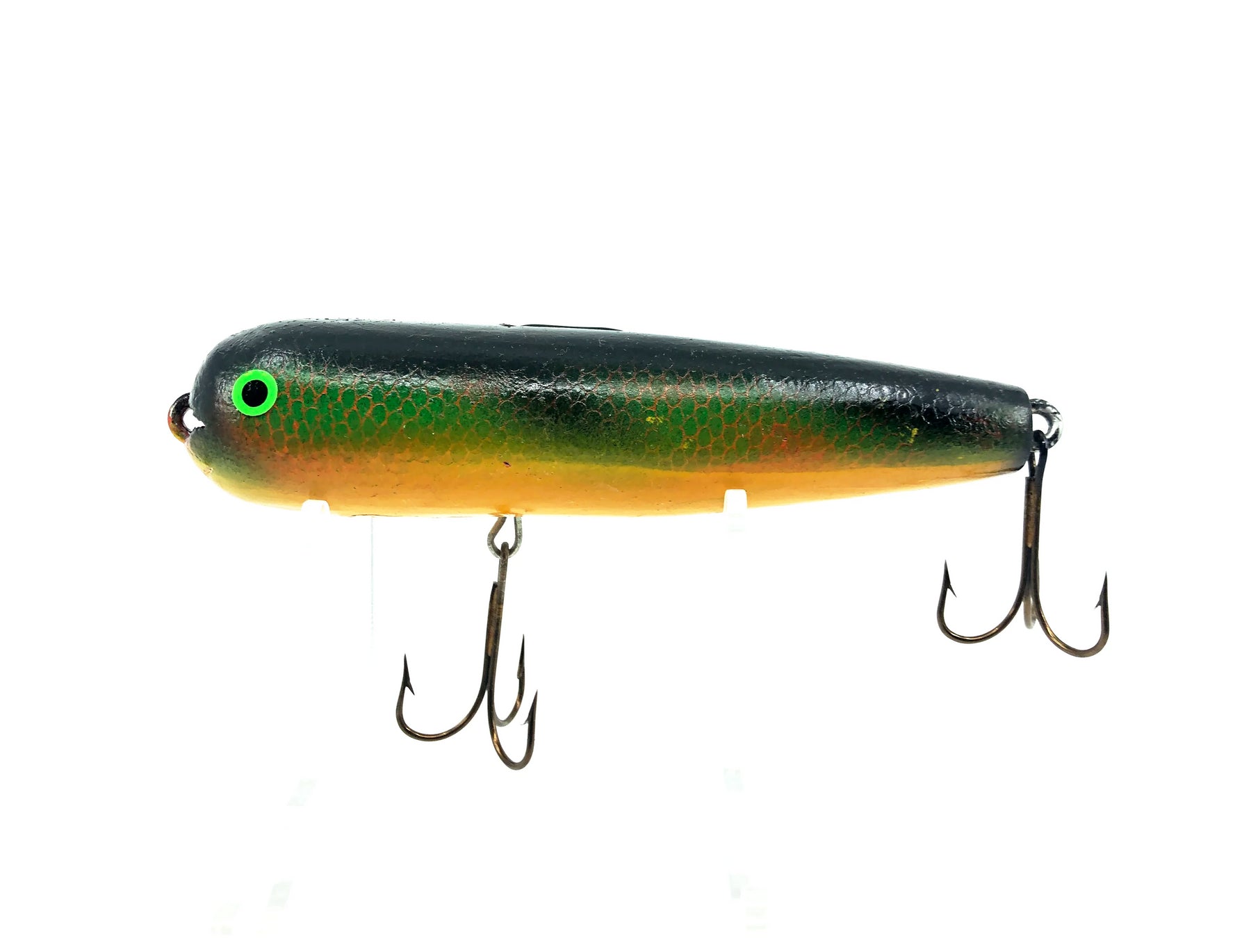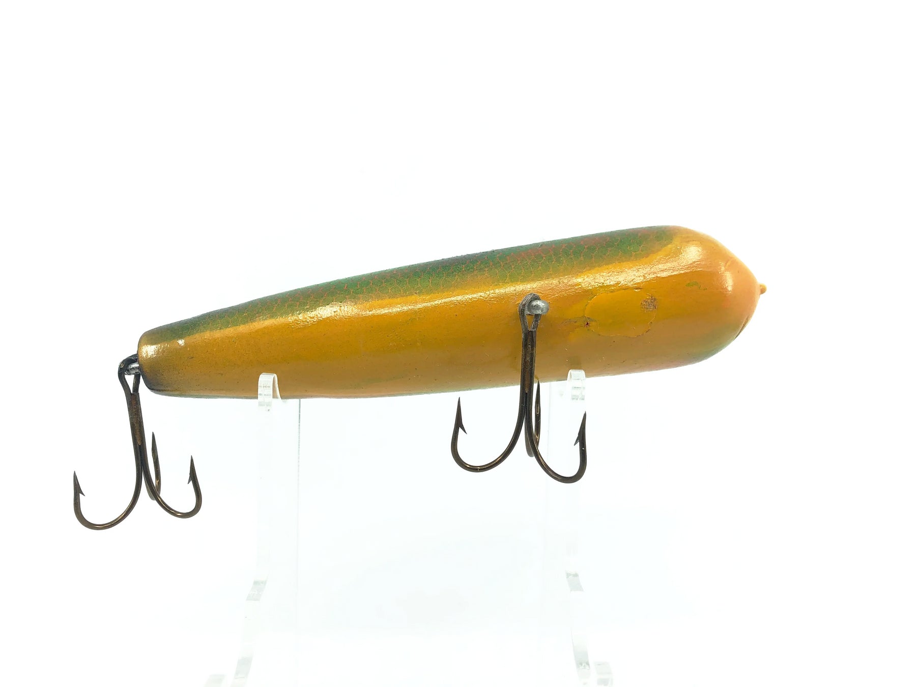 Wooden Topwater Musky Bait Perch Color. Great wooden bait from an unknown maker. Lure is about 6" long. Used with some minor wear but in overall good condition. Fish or collect. See photos.