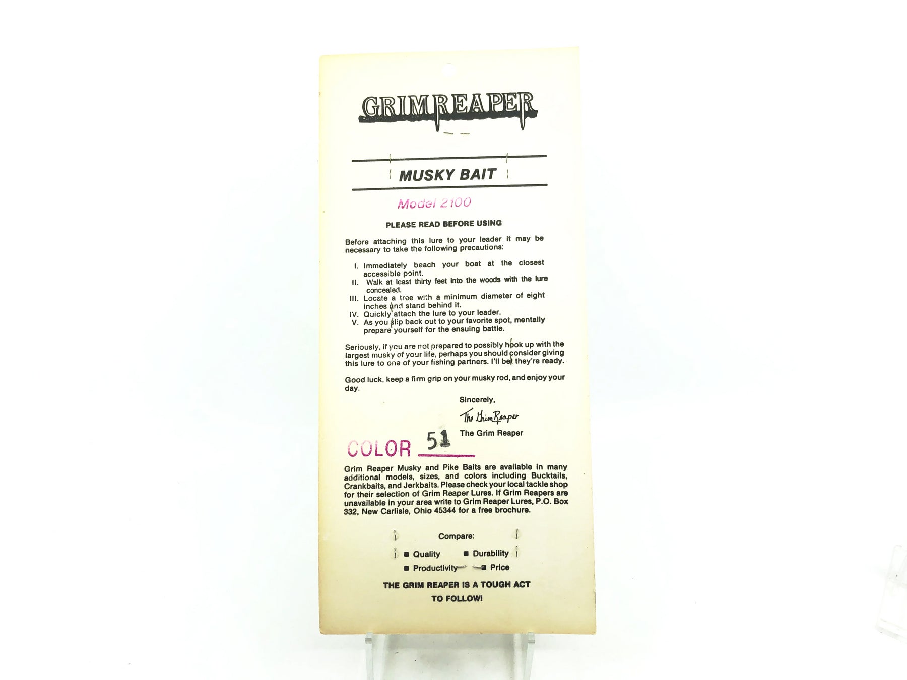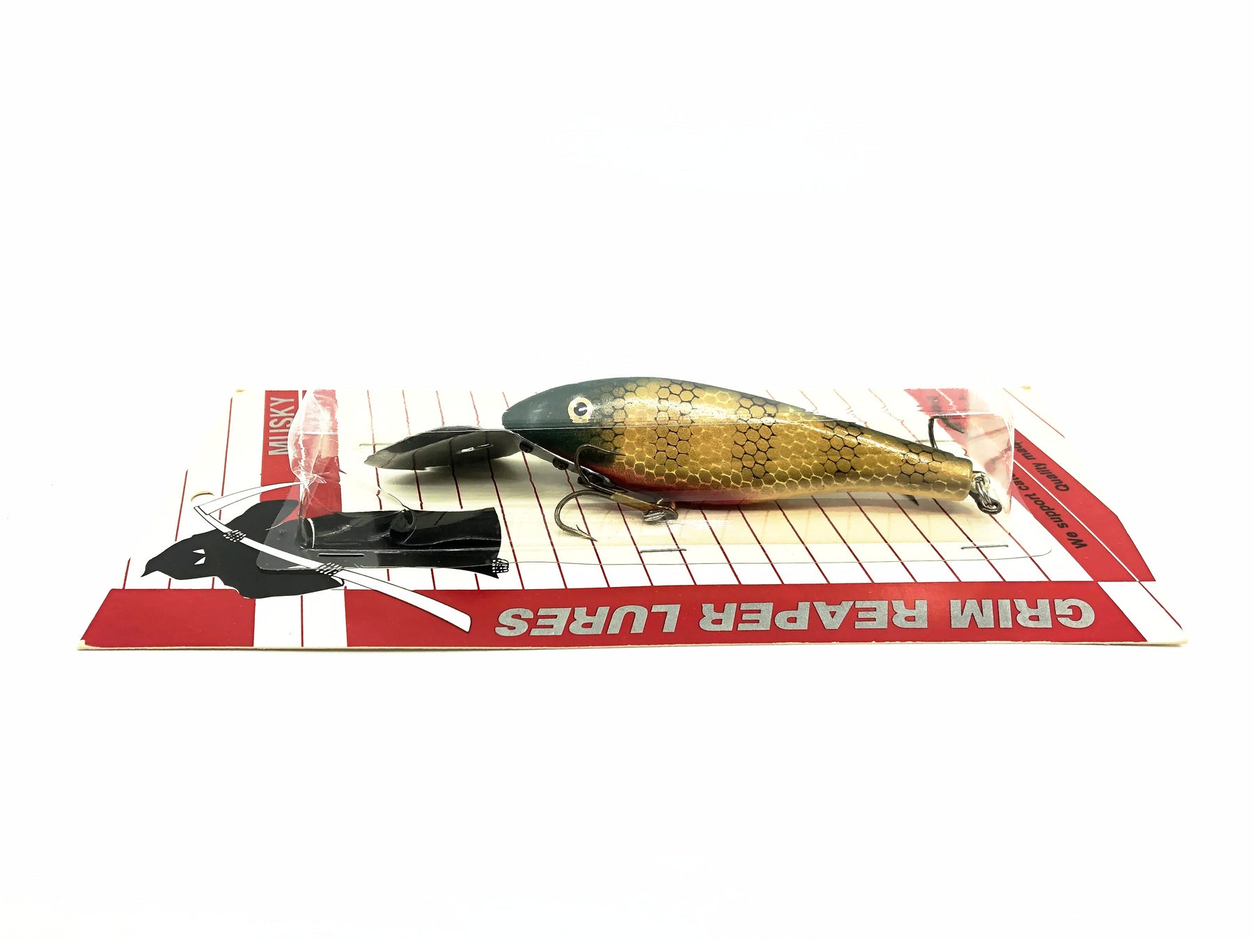 Grim Reaper Musky Model 2100, #51 Pike Color on Card. Great vintage wooden Musky bait that hasn't been made in a while. The lure's body is about 5 1/4" long. The card is in great condition and the lure is new on card. Grab this lure while you can, see photos.
