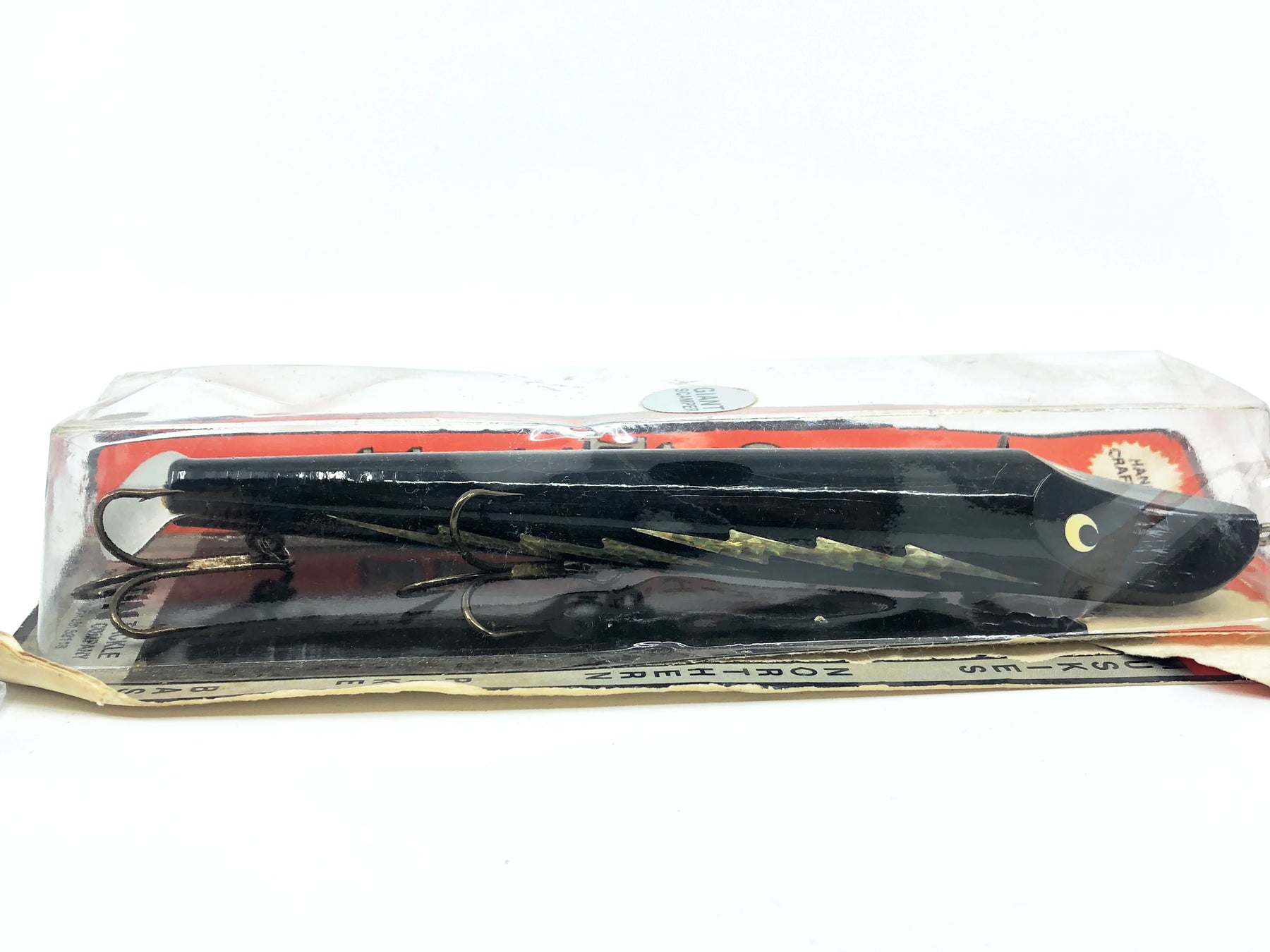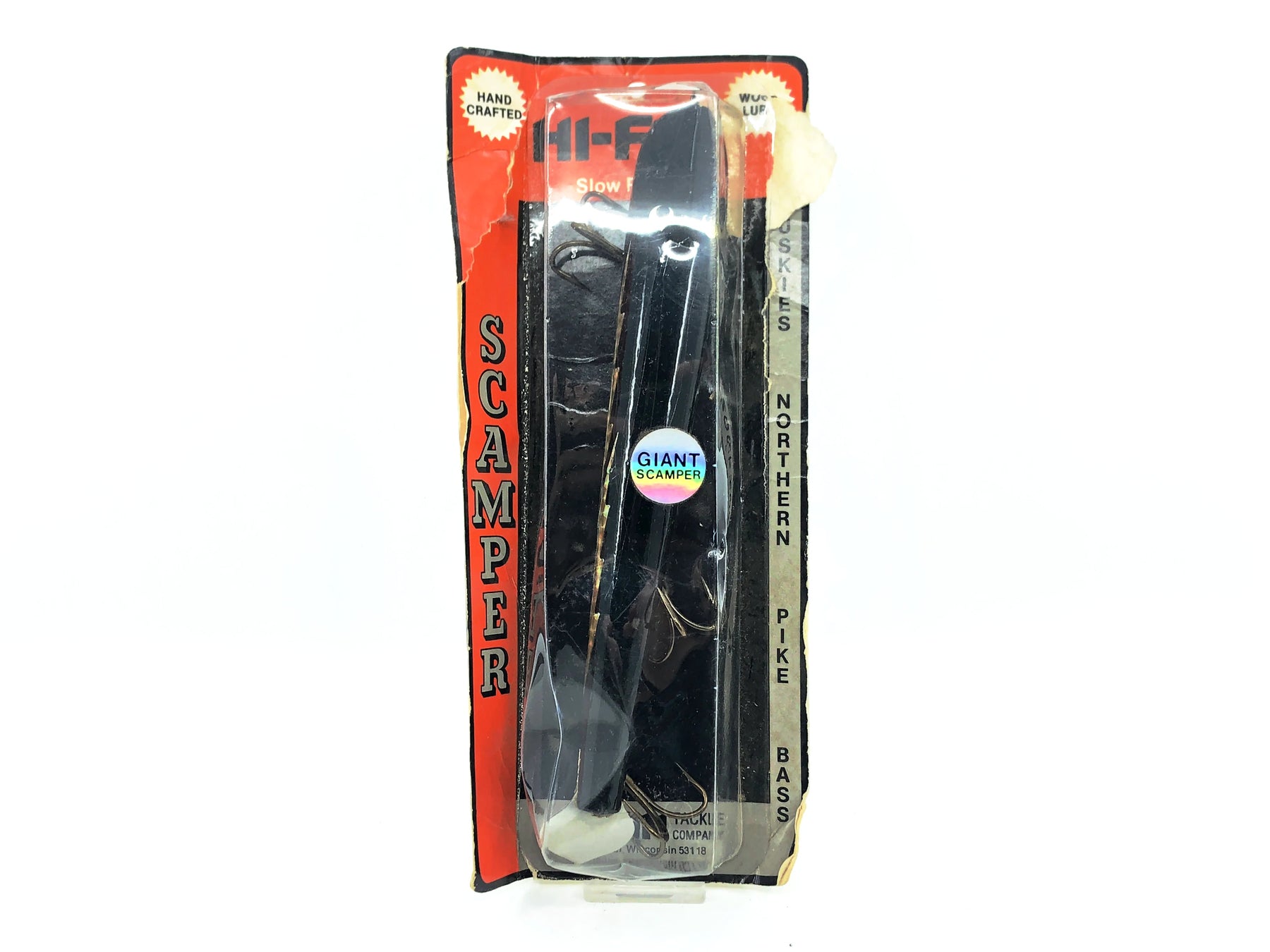 HI-Fin Giant Scamper, Black/Silver Lighting Streak Color on Card. Classic Wisconsin musky bait. This lure is about 8" long excluding the lip. This card has wear and the bubble is peeling off. The lure is new on card. Fish or collect, see photos.