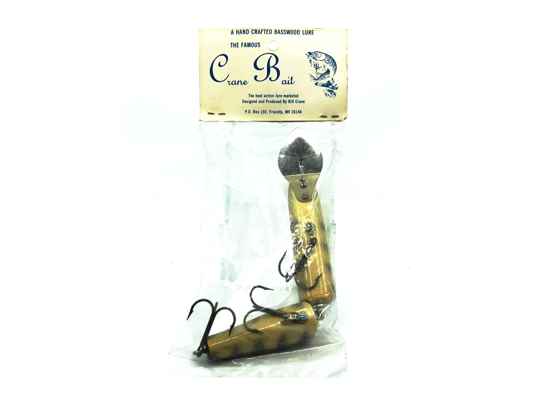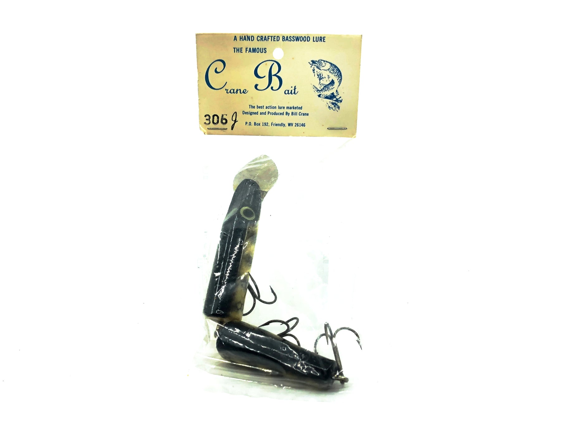 Crane Jointed Pikie Musky Lure, Black Perch/White Belly Color on Card. Unsure of the exact color code of this bait but it's definitely a rare Crane bait. Bait is about 6 1/2" long.  Card has some minor wear and marks but bait is new on card!  See photos.  Great classic bait here.  A tougher model to find. 306J I believe