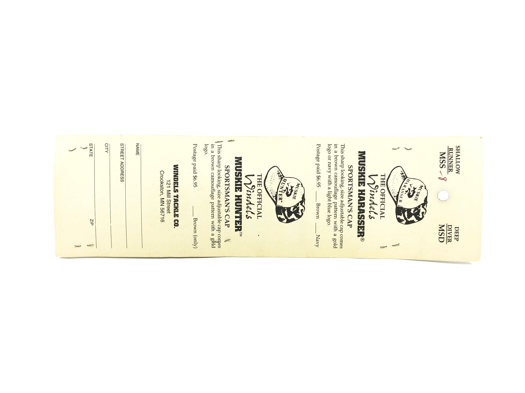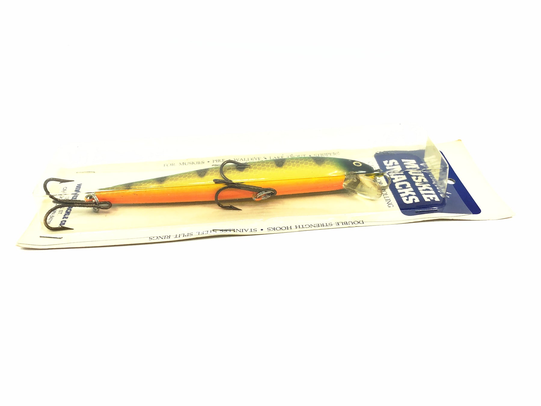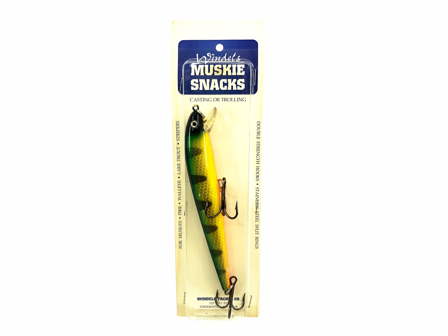 Windel's Muskie Snack's Shallow Runner 6", Perch Color on Card. Uncommon Muskie lure here. Lure is about 6 3/4" long in total. Lure is new on card and the card is in great condition. Fish or collect, see photos.