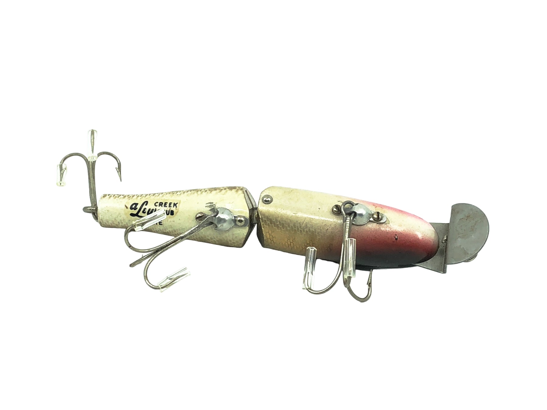 AL&W Creek Chub Jointed Pikie Minnow, Pikie Scale Color. About 4 1/2" long. Cool piece of history and pre-Lucky Strike Pikie. Vintage wooden lure with glass eyes. This one is vintage used with some minor wear but still in overall great condition, see photos. Collect or fish this great vintage lure.