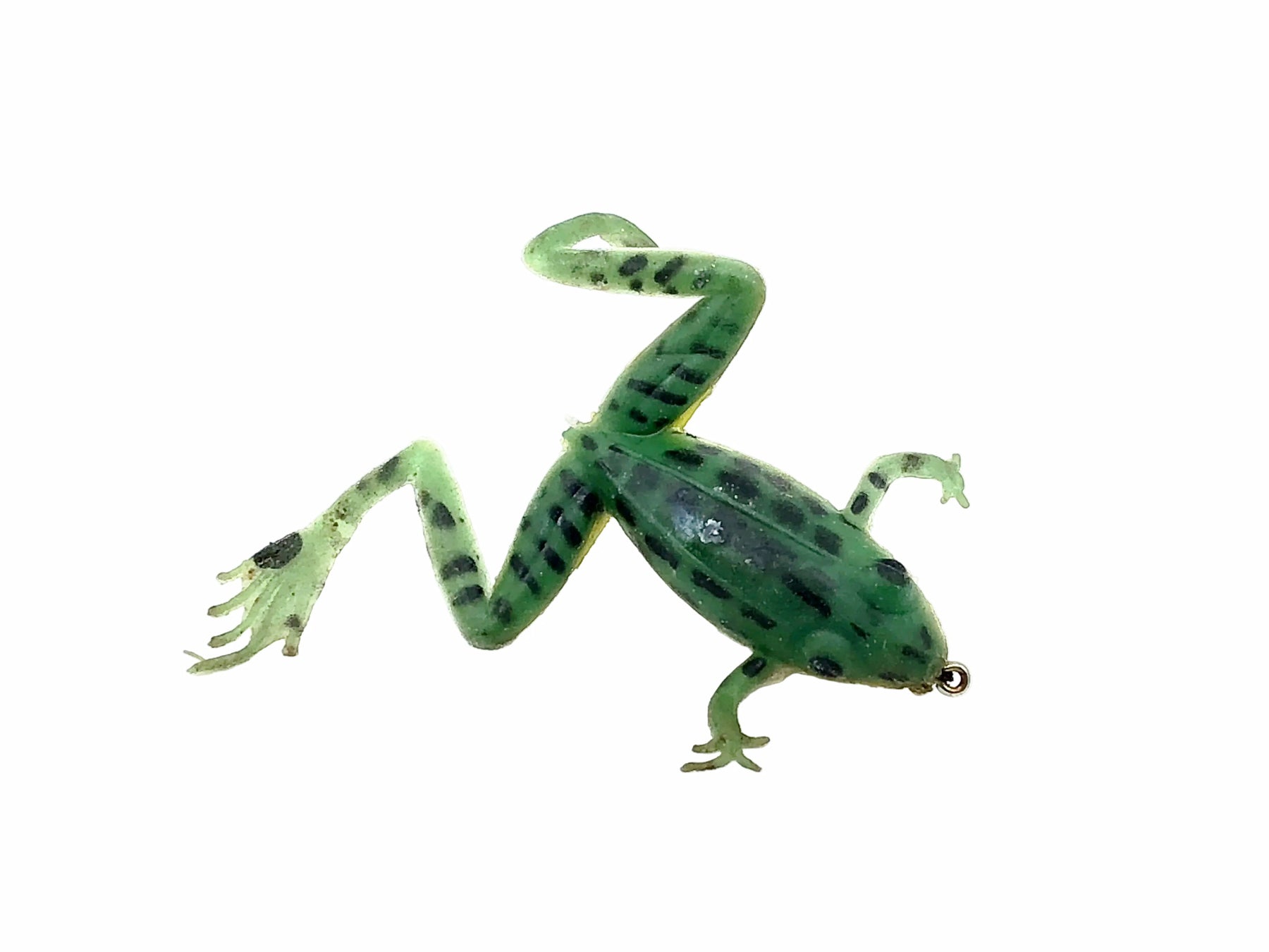Burke 400 Spinning Frog, Green Frog Color. About 2 1/2" long overall. This lure is used with some minor wear but in overall good condition. Although this lure is flexible the soft plastic is also incredibly durable. Very unique bait you won't see often, fish or collect. A classic Burke Flex plug.