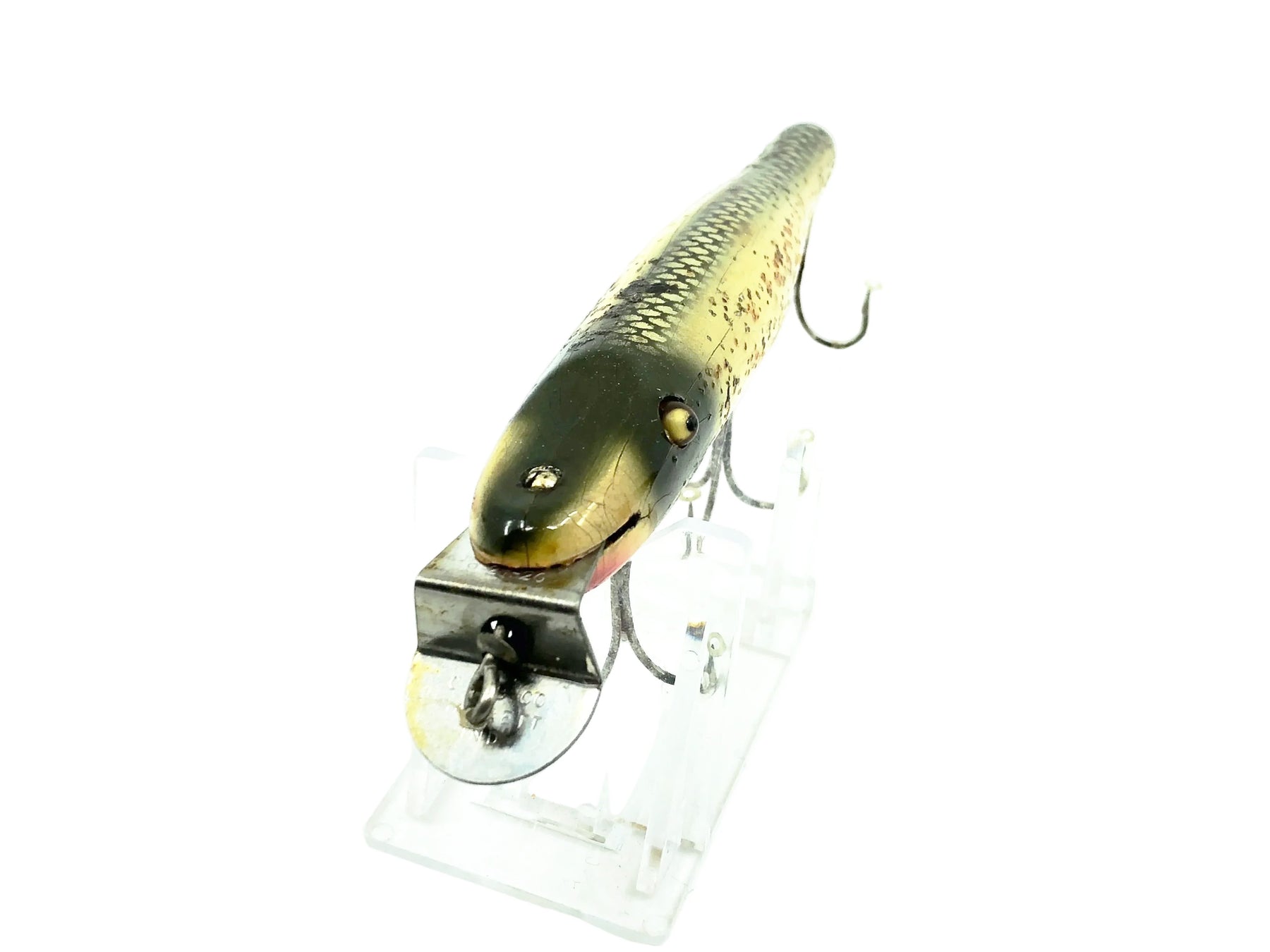 The previous collector spilled some liquid (most likely soda) and didn't notice it until this brown residue was all that was left. I have attempted to lightly remove it however I will let the buyer do any further cleaning. Take note to be careful if you attempt to remove it. Any attempt could damage the paint. With careful cleaning it should come off.  We have been successful on other lures from this case but it time consuming to do on every one.