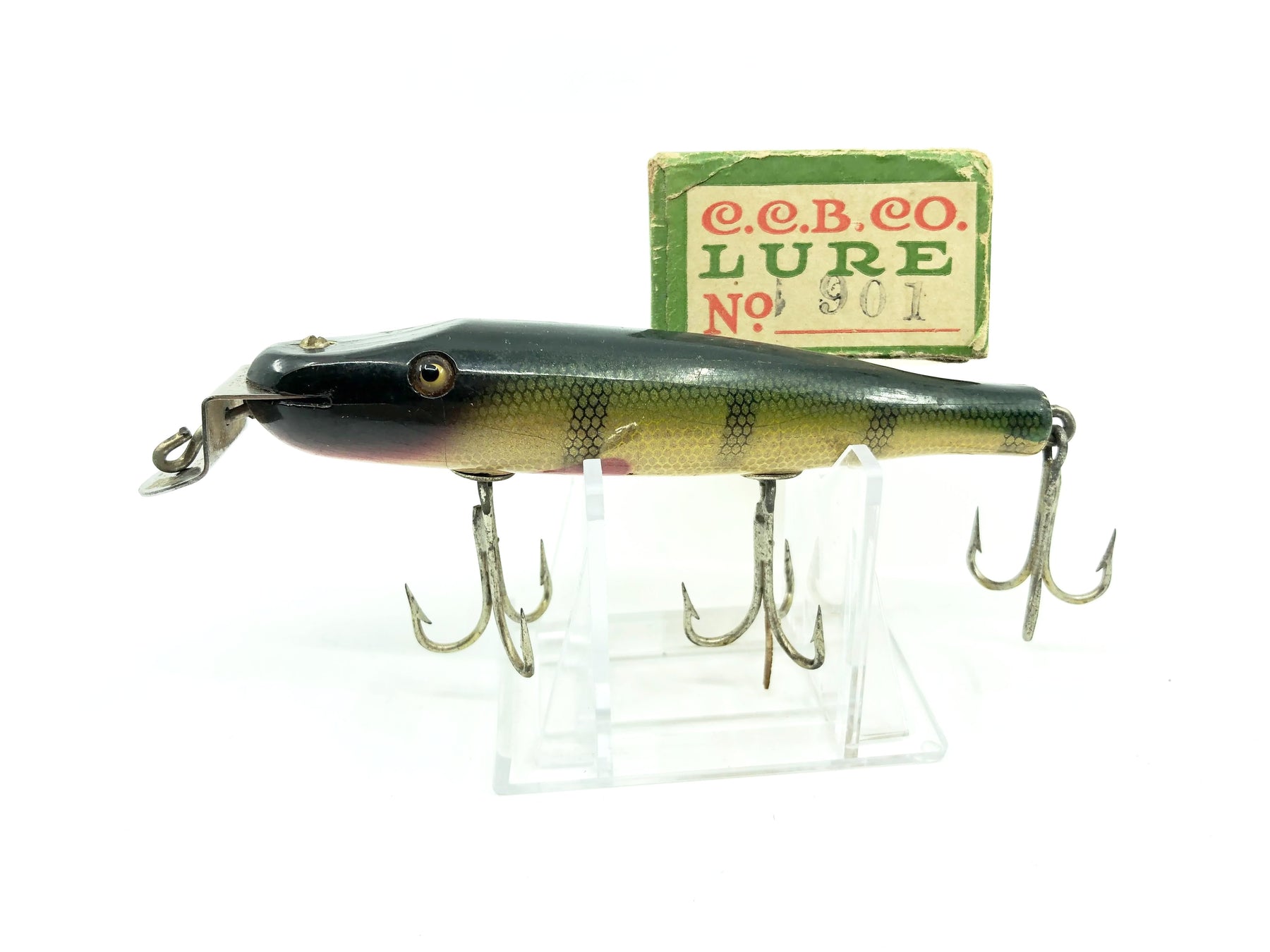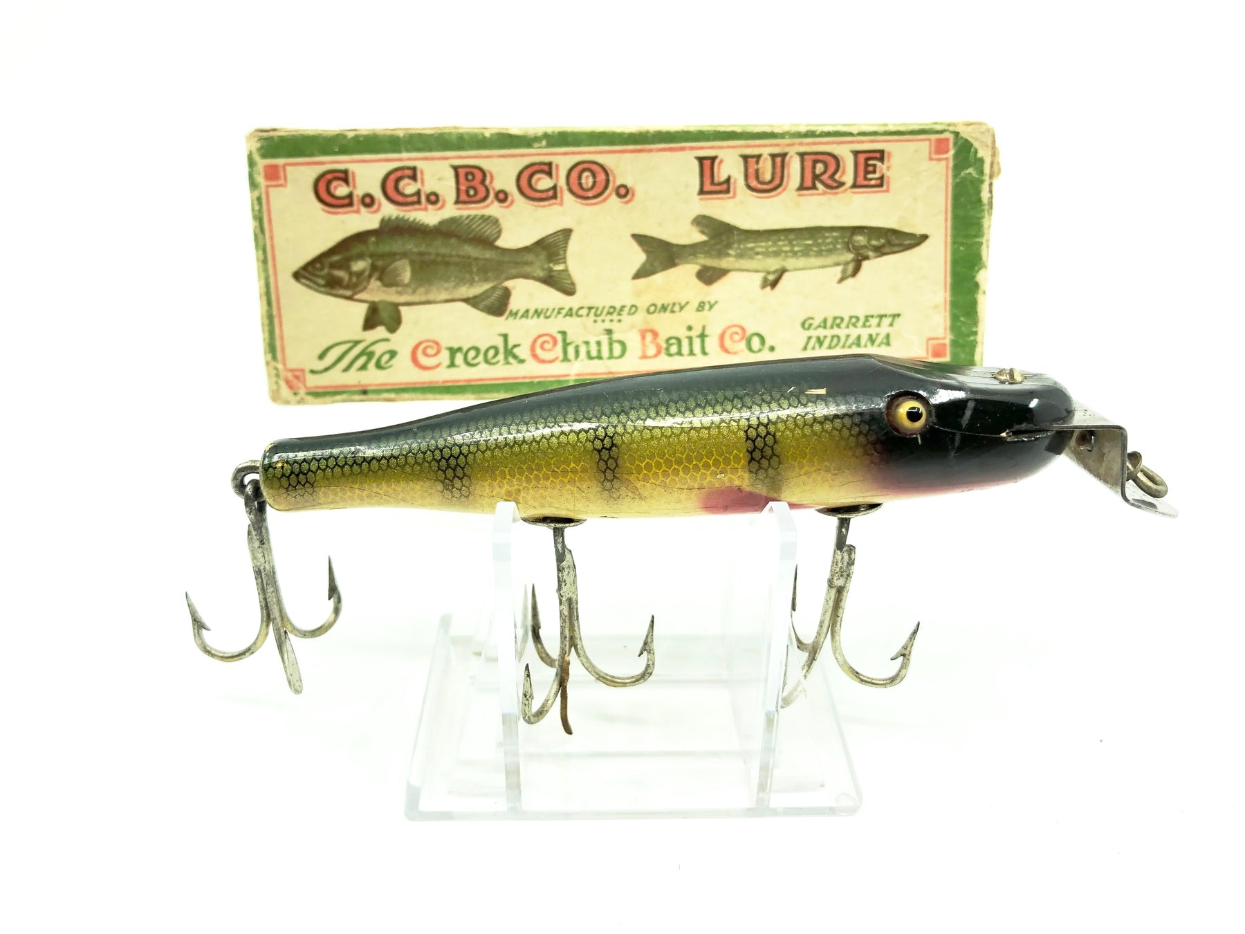 Creek Chub 700 Pikie in Perch 701 Color with 901 Box. About 4 1/4" long. Great vintage lure here. Wooden lure, glass eyes. Comes with a box for a Baby Pikie in Perch Color. Lure is vintage, with minor wear but overall good shape. Box has some minor wear but overall in good shape. Even though the box isn't an exact match, it's still a nice looking combo. This one won't last long so grab it for your collection while you can. See photos.