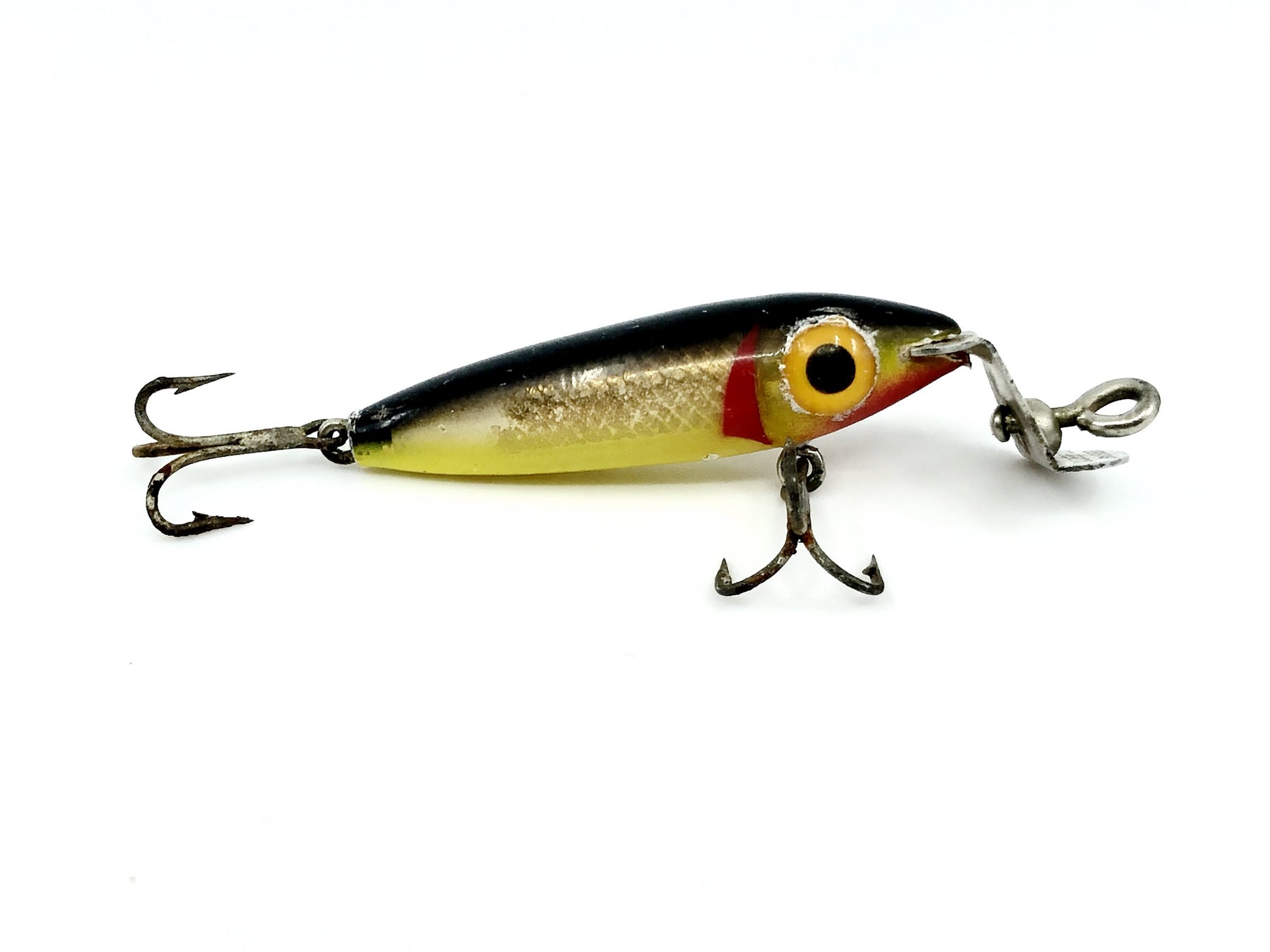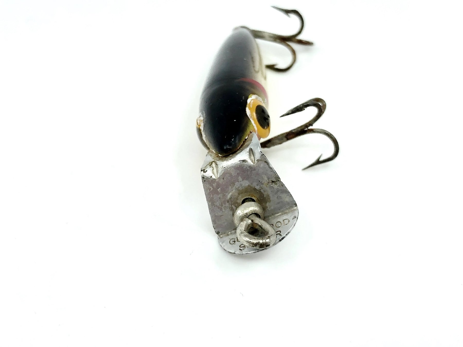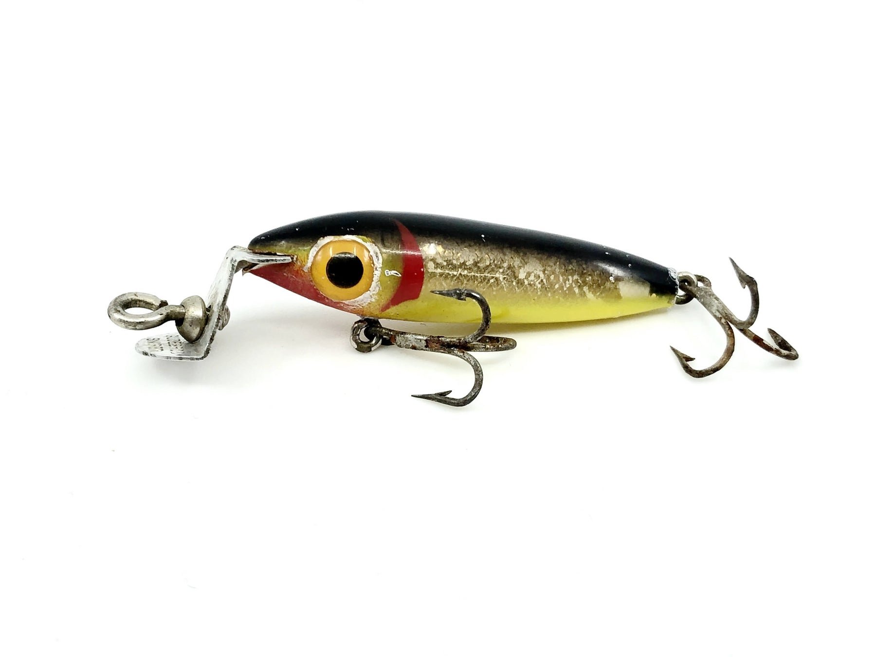 Gudebrod Golden Eye Sniper Black and Yellow Minnow Color. About 1 3/4" long body, 2" with lip. Used vintage lure with some minor wear but overall good condition. See photos. Fish or collect this classic lure.