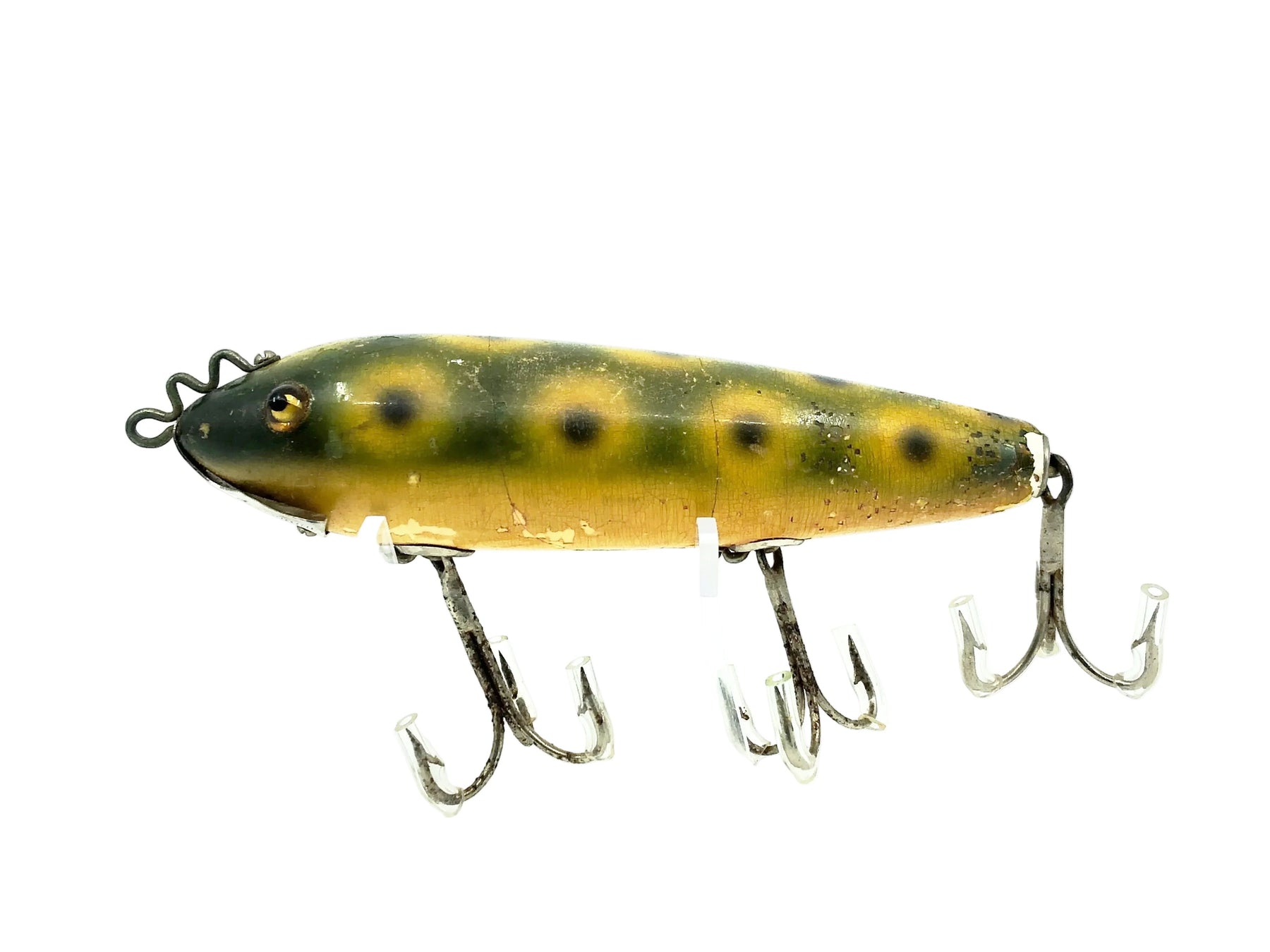 Heddon 1700 Near Surface Wiggler, 9B Frog Spot Color. Uncommon Heddon lure made from ~1916-1926. Lure is about 4 1/4" long body. Wooden lure, glass eyes. Used with some wear and marks as shown but still in overall good condition. Nice color. Add to your collection, see photos.