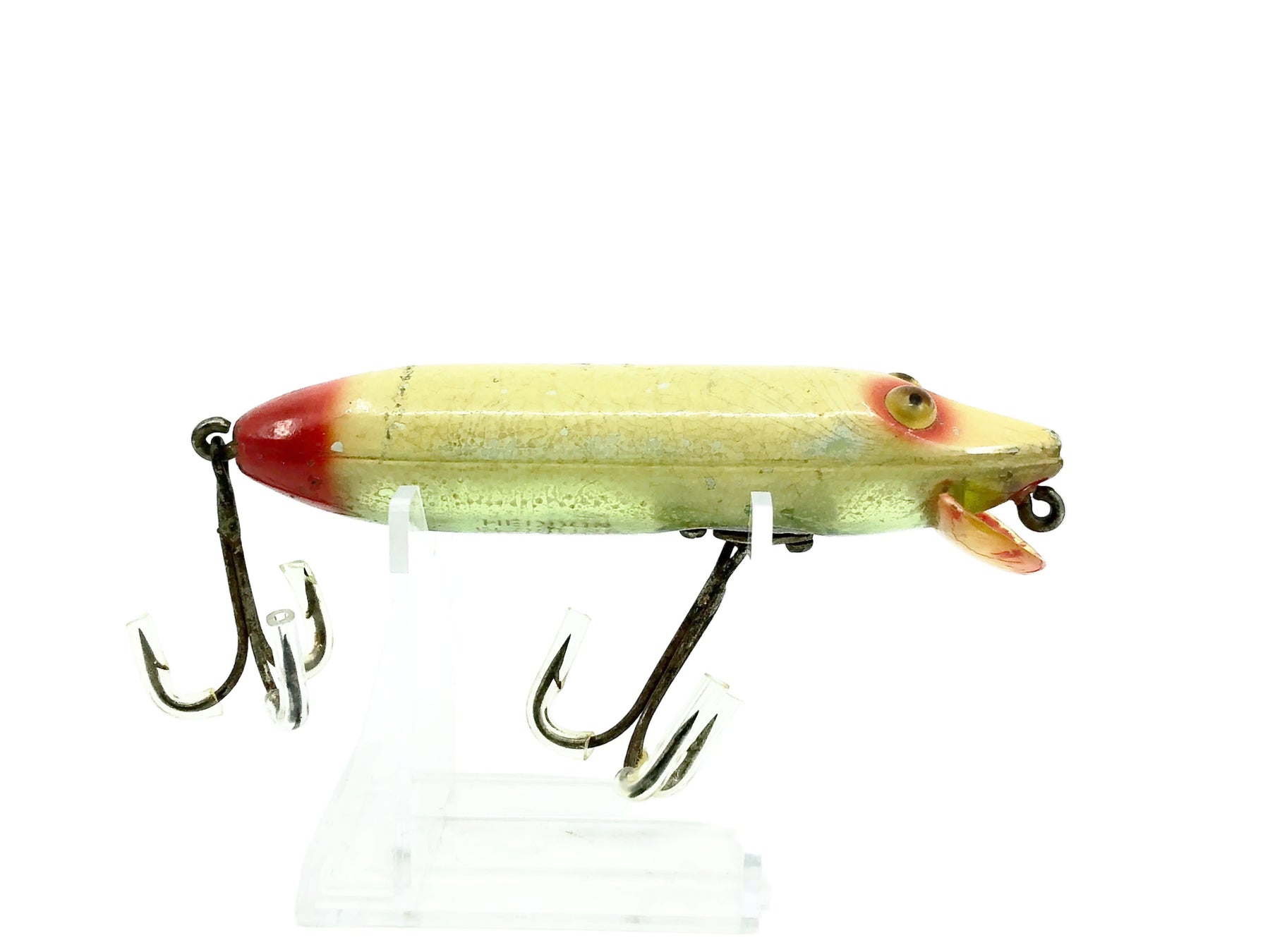 Heddon 9500 Floating Vamp Spook, RET Red Eye & Tail/White Color - 1931-34 - Tough. Lure is about 3 3/4" long body. Plastic lure, glass eyes, plastic lip. An early Heddon entry into plastic baits and with glass eyes. Not many of these survived. Dates from 1931-1934. Used with some wear and marks but still in overall good condition. Add to your collection, see photos.