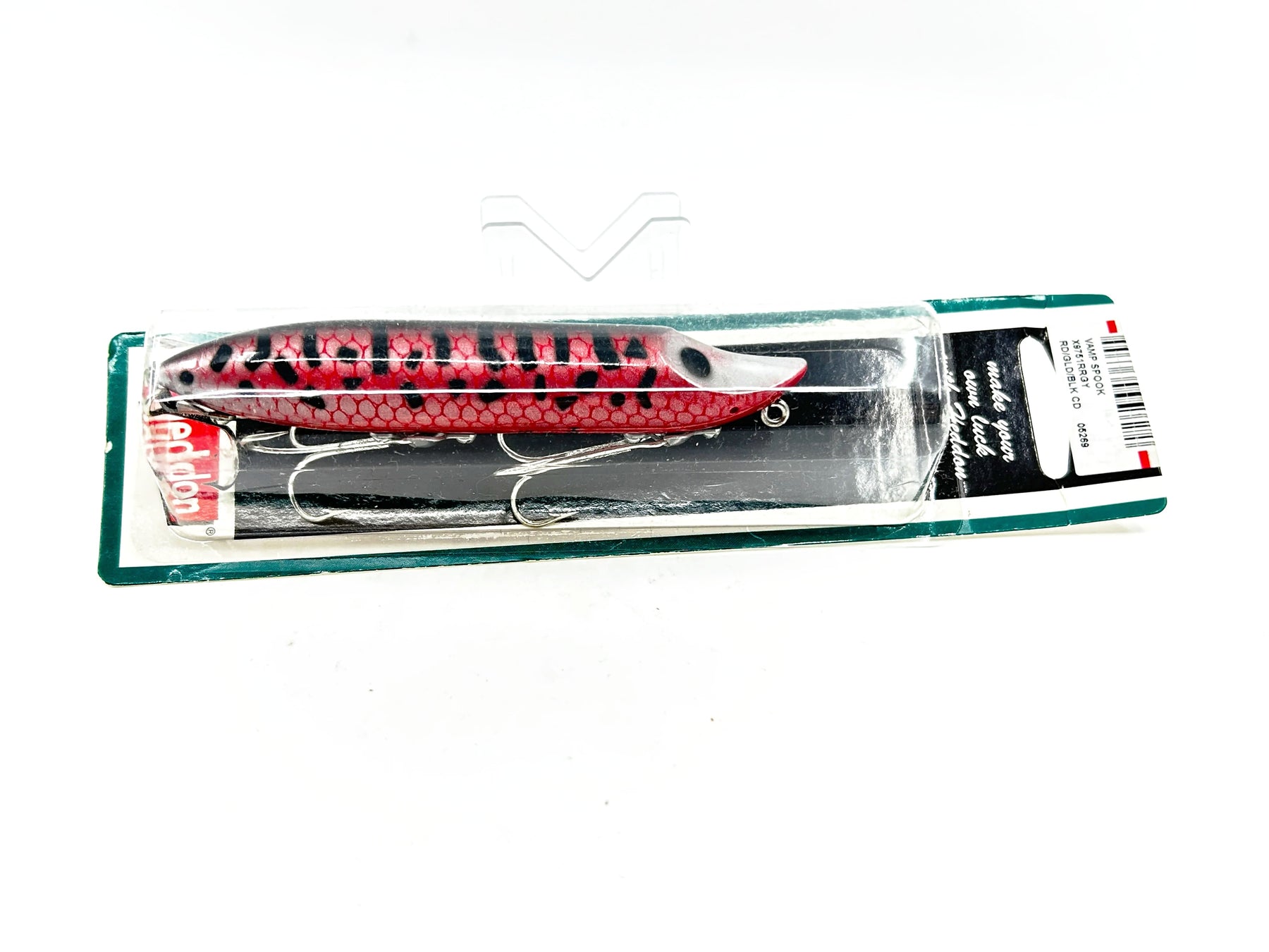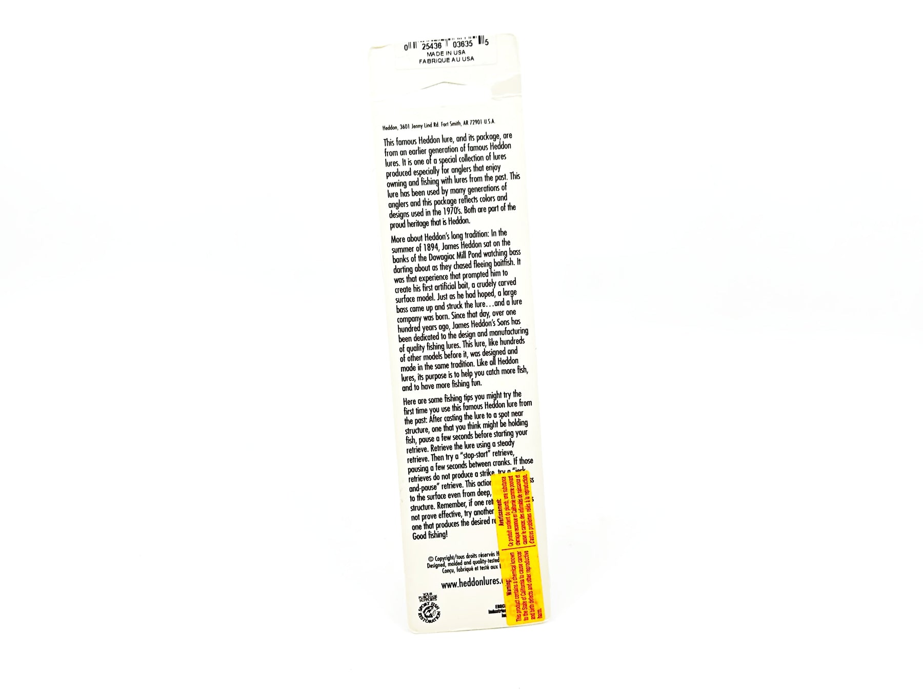 Heddon No-Lip Vamp Spook RRGY-Red/Gold/Black Coach Dog Color on Card. About 4 1/4" long. Card has some minor wear but overall ok shape. Lure new inside card. Tougher color to find. Classic Heddon bait to fish or collect. See photos. One of the best baits ever made! See photos.