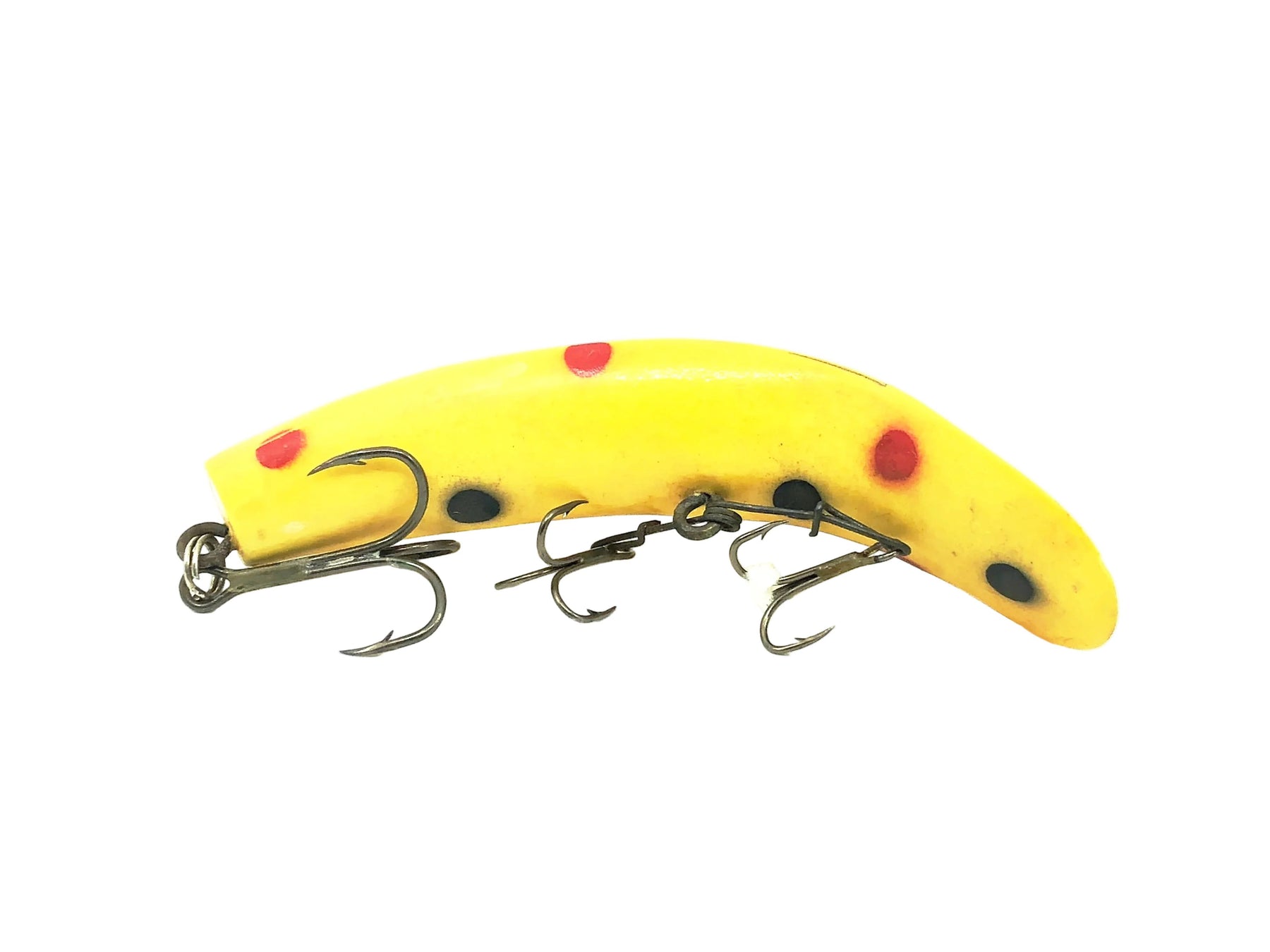 Helin Flatfish S3, YE Yellow/Dots Color. Very old plastic Flatfish. About 3 5/8" long. This vintage Flatfish is used with some wear and marks but in overall good/fishable condition, see photos. Dual hook hanger model. One of the most successful fishing lures ever made. Fish or collect! Vintage plastic version.