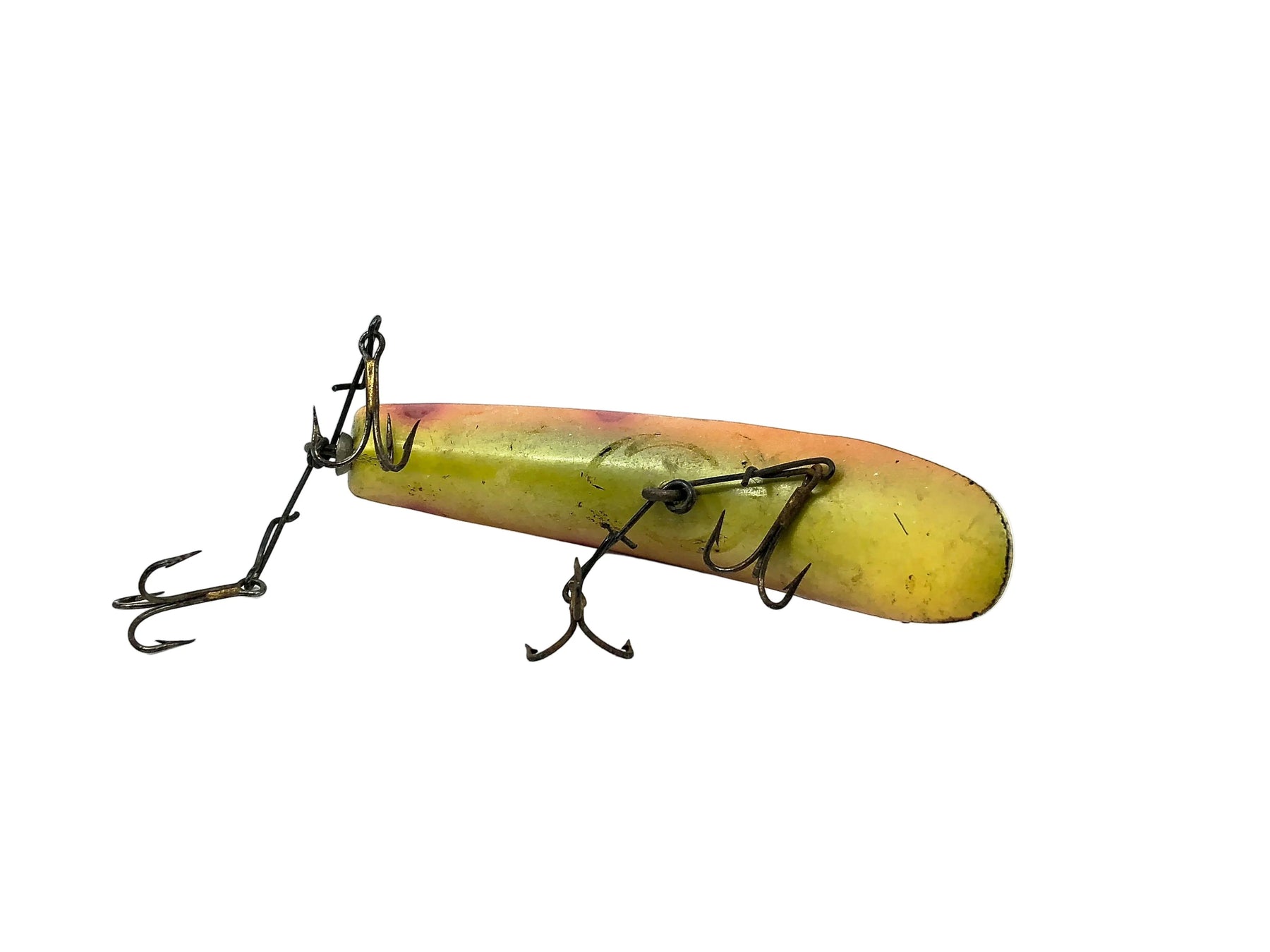 Helin Flatfish U20, OP Orange Pearl Color. About 3 1/2" long. Used with some minor wear and a broken barb but in overall good condition. One of the most successful fishing lures ever made. Fish or collect! Vintage plastic version.