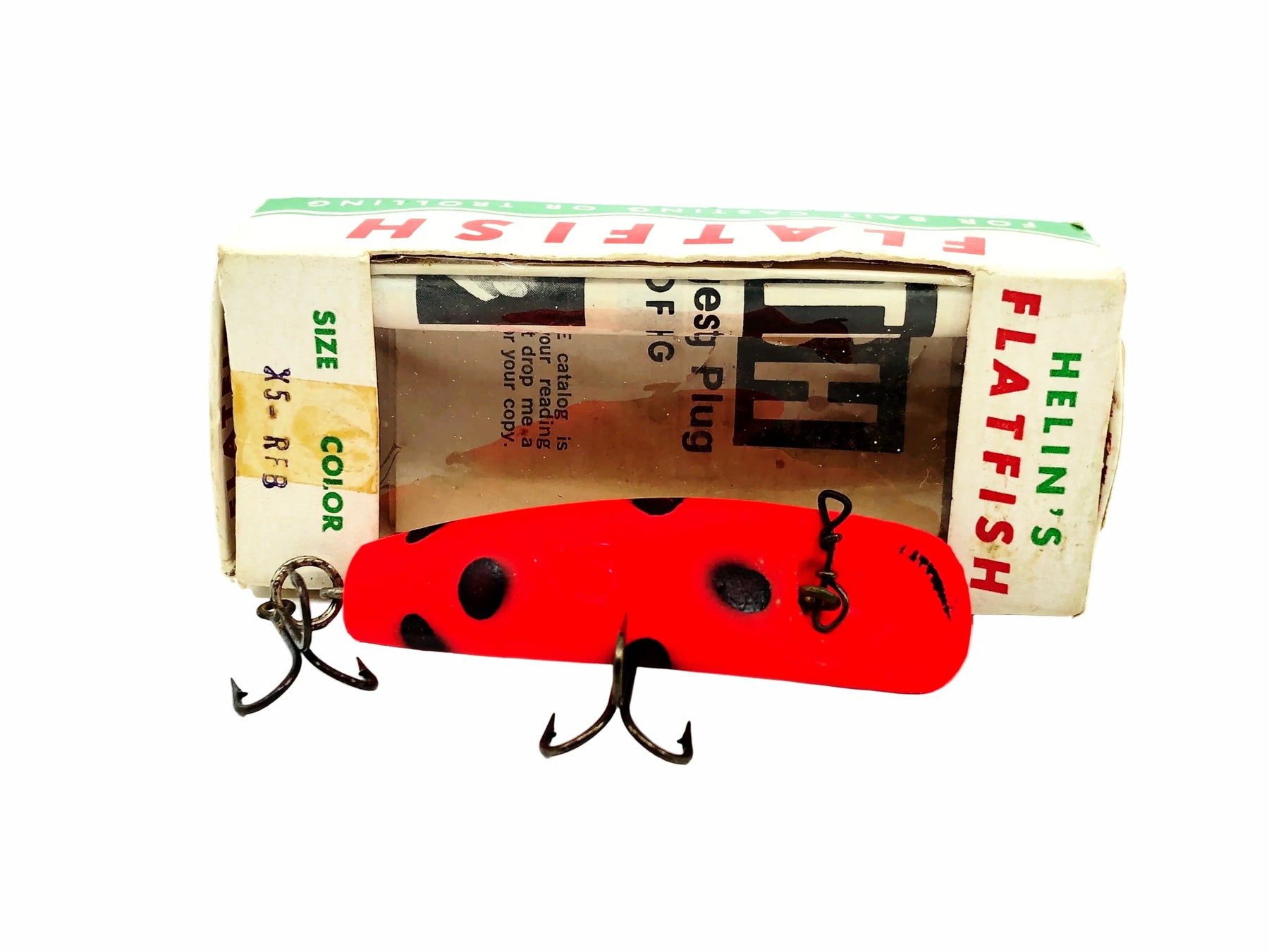 Helin Flatfish X5, RFB Red Fluorescent/Black Spots Color w/Box. Lure is about 3" long. Lure is is used with some minor wear but in overall good condition. Matching box has some wear but is in overall good condition. See photos.
