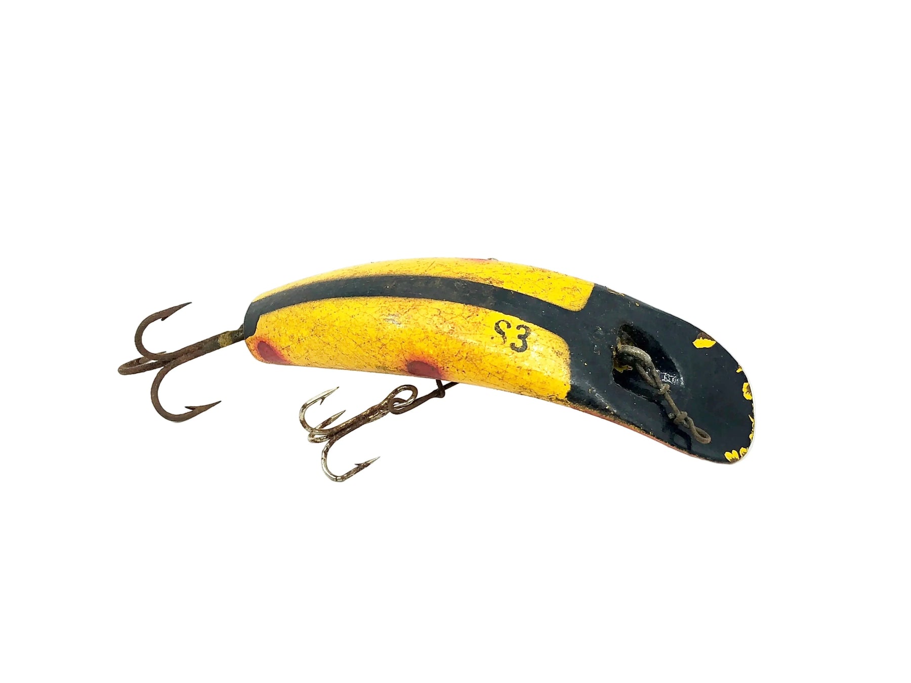 Helin Wooden Flatfish S3, LOB Light Orange Black Stripe Color.  About 3 3/4" long.  Used with some minor wear and marks but overall good condition, see photos.  One of the most successful fishing lures ever made.  Fish or collect!  Vintage wooden version.