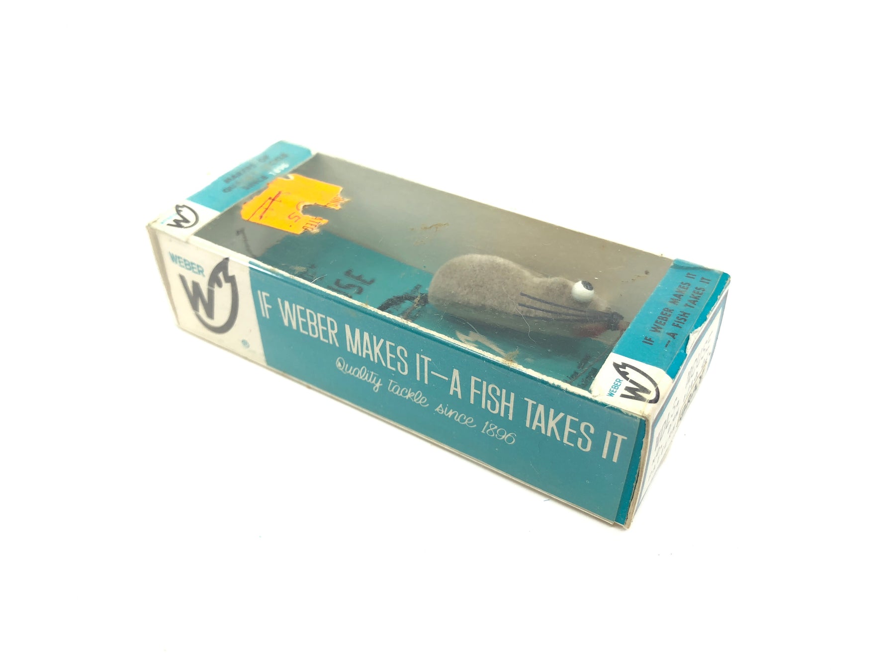 Weber Weedless Spin Mouse Gray Color New in Box Old Stock 1/10 oz Tough Size.  Don't believe this box has ever been opened.  Tougher small size, mouse body about 1 1/2" long not including tail.  Lure in new condition.  Box has some minor wear.  Great combo.  Hard to find lure for the mouse collector.  See photos.