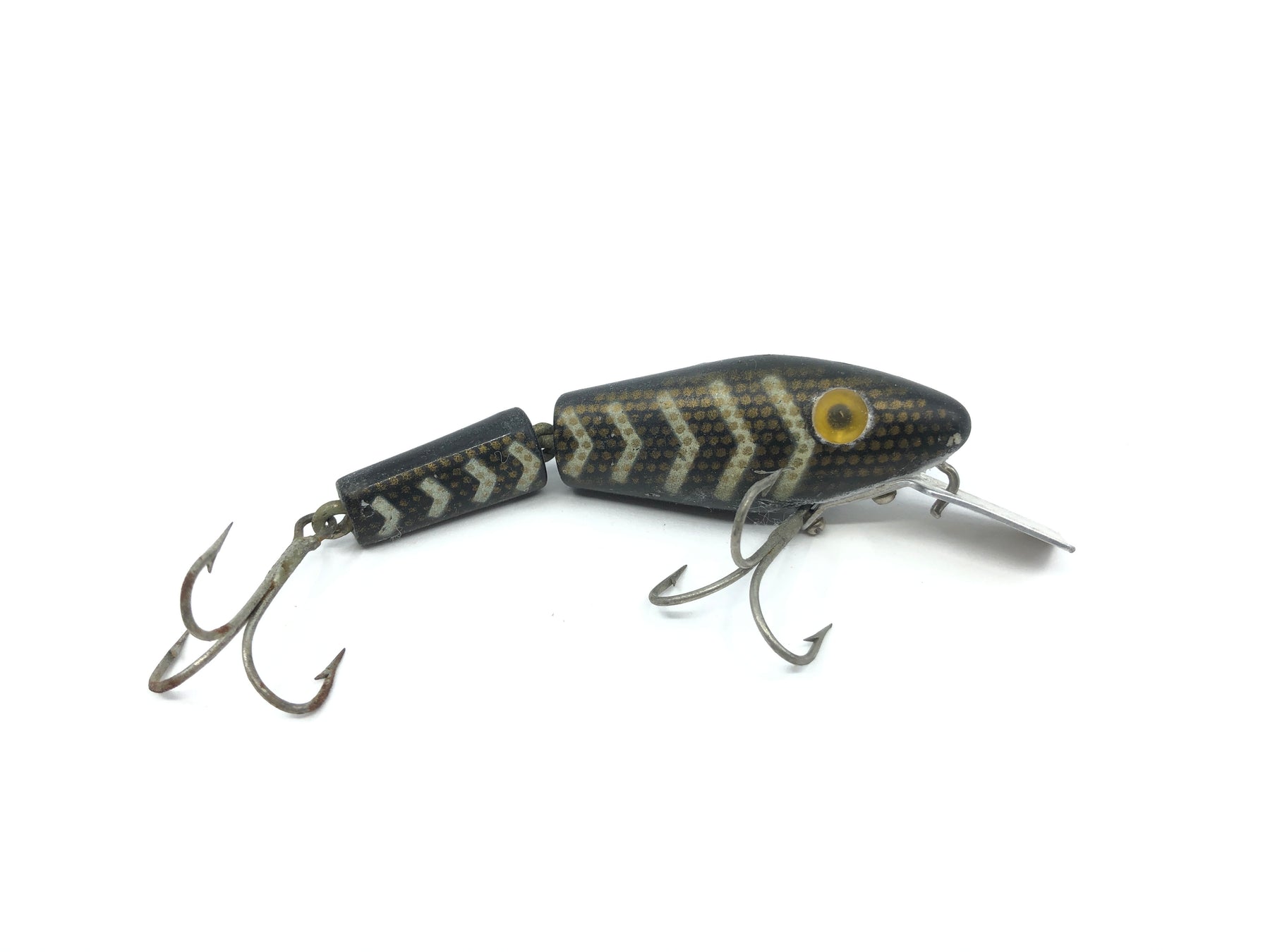 L & S Bass Master Model 25 Black with White Bars Vintage Lure. About 3" long excluding lip. Used with some wear and some waxing of plastic. Should clean up better. Still overall good condition, see photos. One of the classic lures from decades ago.