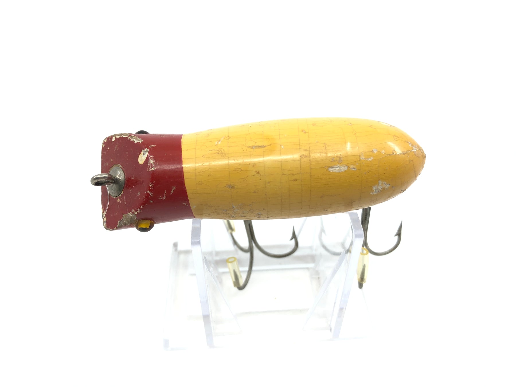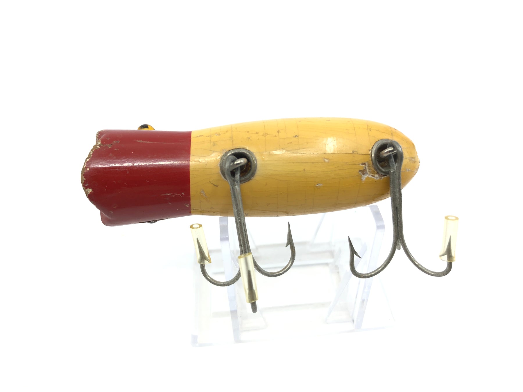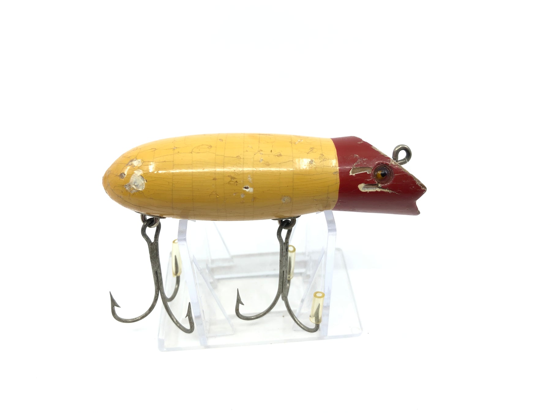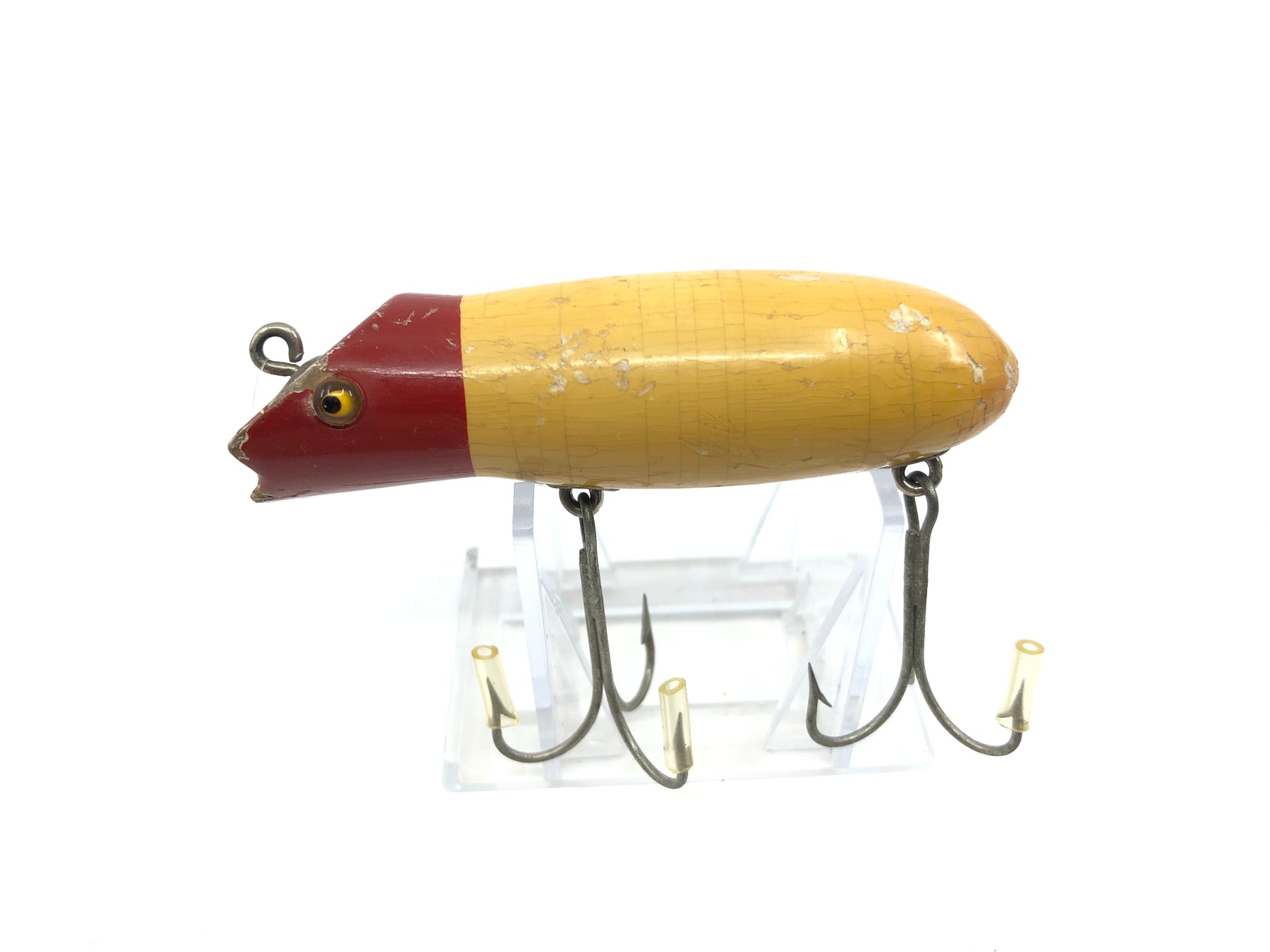 Shakespeare Swimming Mouse 578 Red White Early Model Glass Eyes Round Body. About 3 3/8" long. Used with wear but still overall ok condition, see photos. Tougher to find early model. Notice rounded belly.