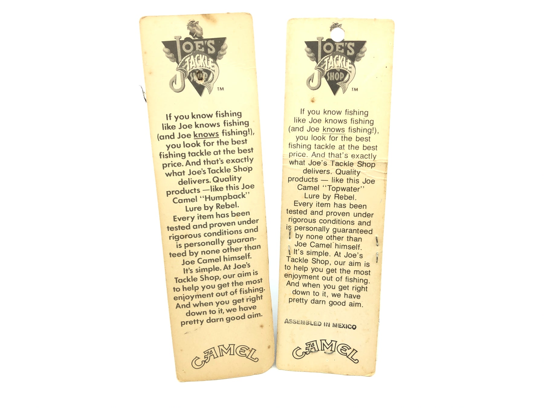 Lot of Two Joe Camel Novelty Rebel Lures New on Cards Old Stock.  Two lures here.  One is a Topwater, one is a diving bait.  Cards have some wear with one having the bubble stapled back on.  Still display well.  Lures new on card.  Grab both for a deal.