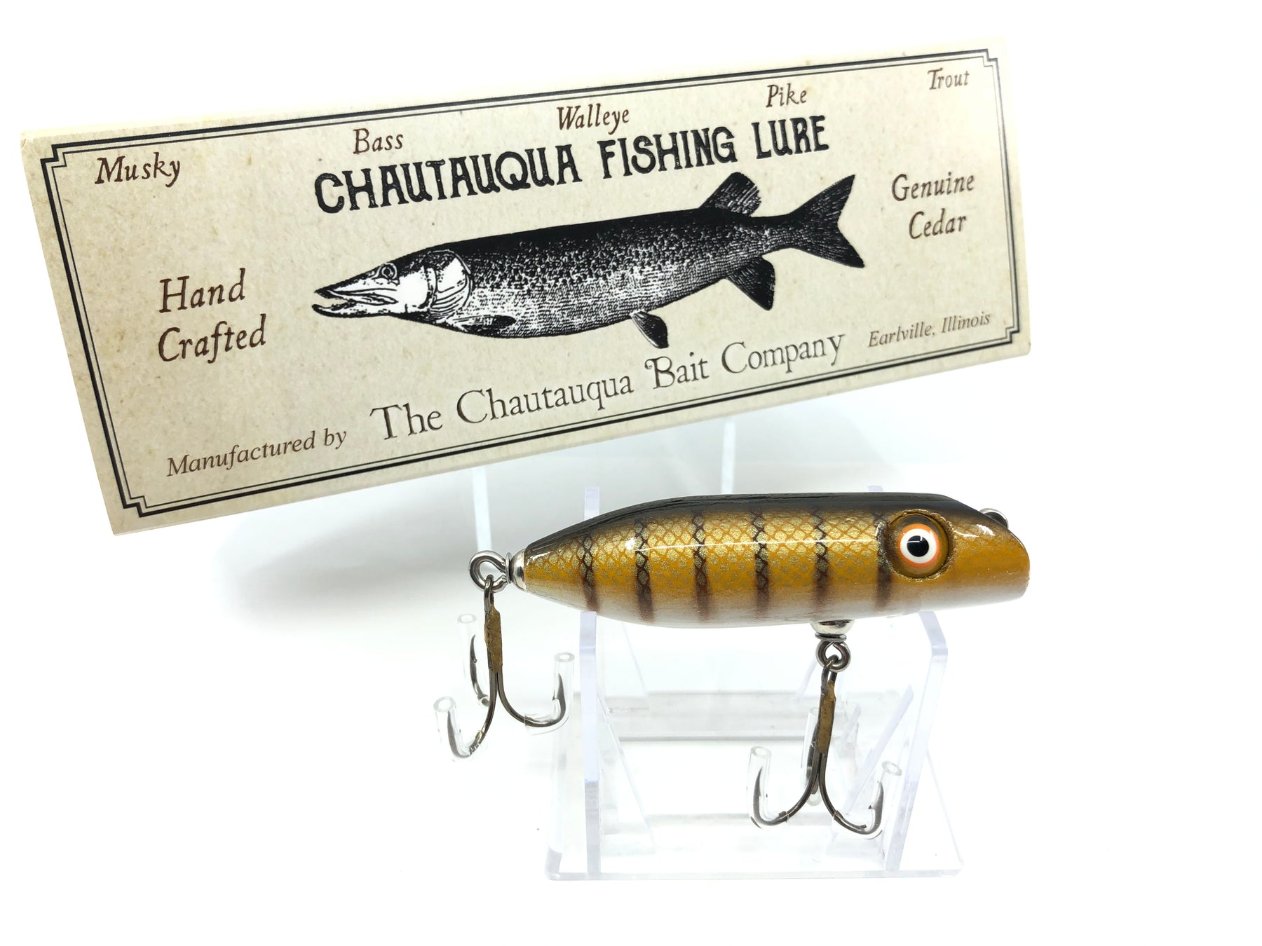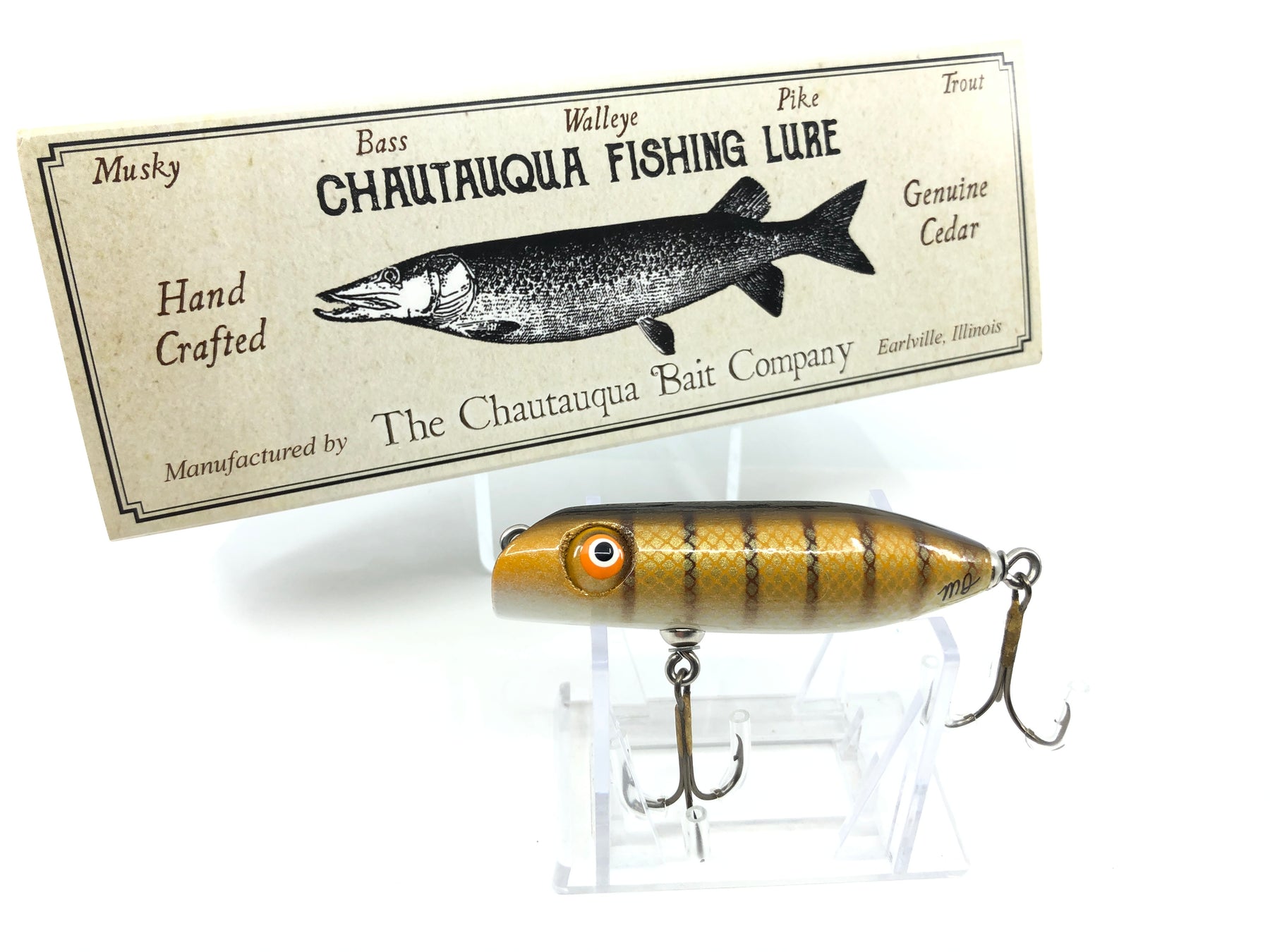 Chautauqua Special Order Wooden 3" Bass Oreno in Vintage Pike Color with Box. About 3" wood body. Hard carved, hand painted work of art here. Fish or collect. From the master at Chautauqua comes the great Bass Oreno. One of the classic fishing lure designs of all time. Take a look at the photos and don't hesitate as this one won't last long. This is absolutely a thing of beauty.