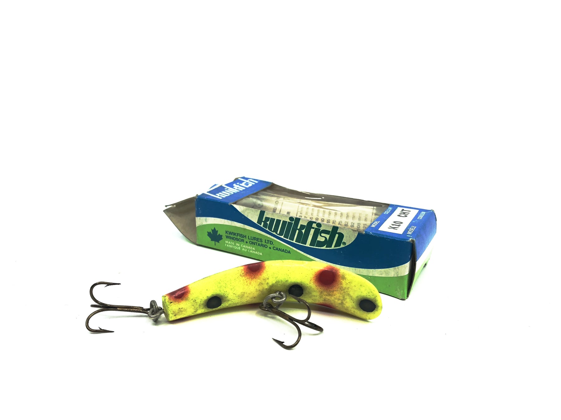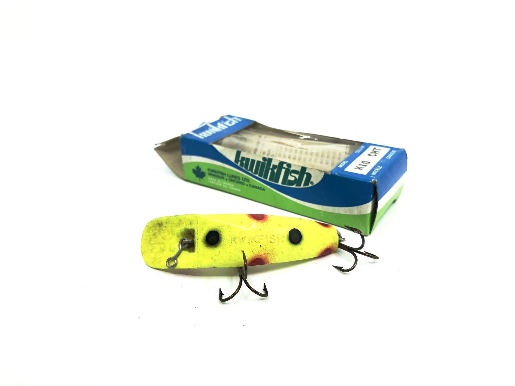 Pre Luhr-Jensen Kwikfish K10 CHT Chartreuse Color New in Box Old Stock. Pre Luhr-Jensen and Pre Rapala. The K10 is listed as 3" long and weighing 7 grams. New old stock here. Box in nice shape aside from some minor wear and dents, lure has some wear and dirt from age, see photos. Cast or troll. Awesome lure for fishing, especially muskies, big pike, bass and walleye and very tough to find. Grab this one while you can. Collect or fish.