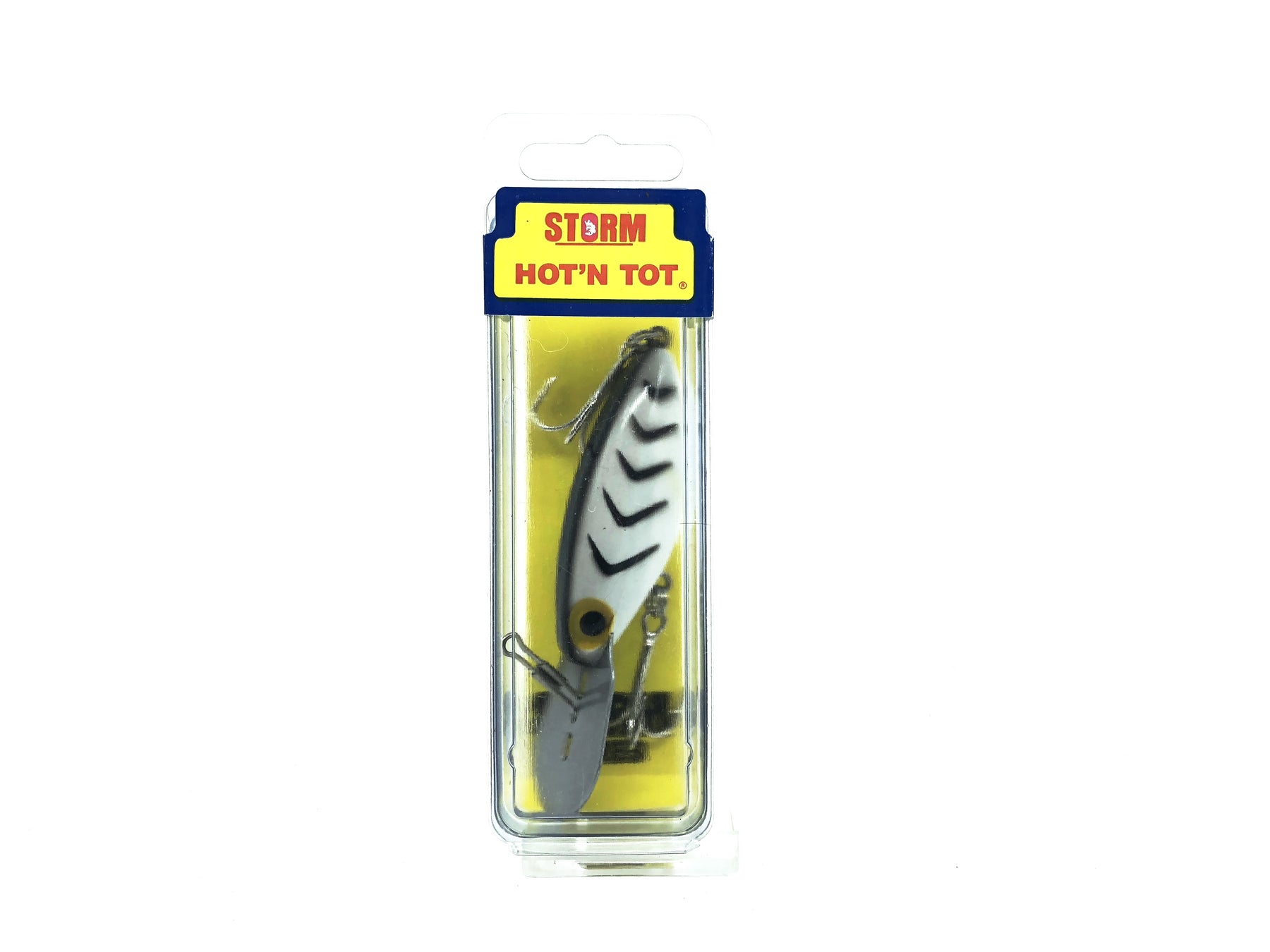 Storm Thin Fin Hot 'N Tot AH22 White Black HB Color with Box. At about 3 1/4" long including the metal lip this newer is in good condition with a little wear. The box has some minor wear but in great condition. Great diving lure that provides plenty of action. See photos.