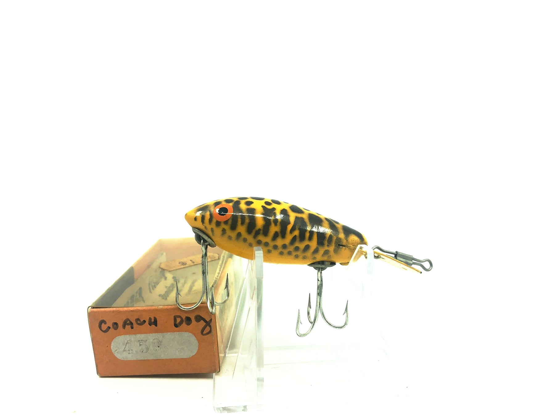 Bomber Wooden 400 Series Color #59 Yellow Coach Dog with Box. At about 3 1/4" long this lure is in very good condition with only a few small marks and writing on the side. Great addition to anyone's collection or tackle box. See photos.
