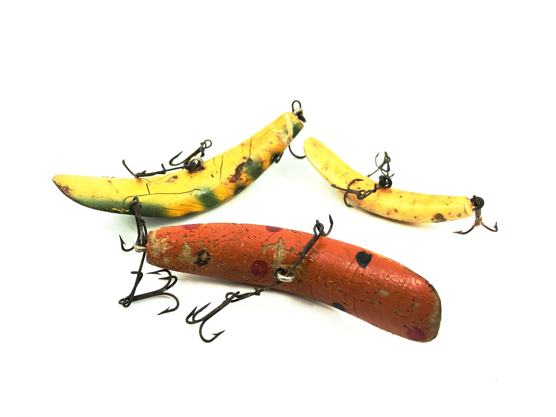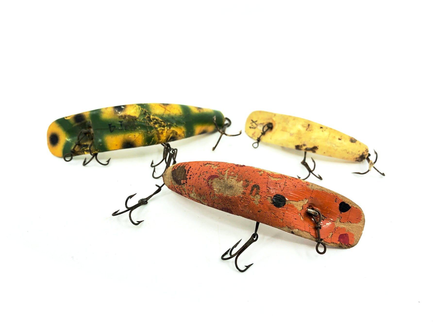 Helin Flatfish Vintage Trio, U20/X4/T4. This pack includes three classic medium sized flatfish including an X4, U20, and a T4. These lures range in size from about 2 5/8" to 3 5/8" long. All are used with wear, but overall in fair condition, see photos. One of the most successful fishing lures ever made. Fish or collect! All have wear but with some TLC, still some life.