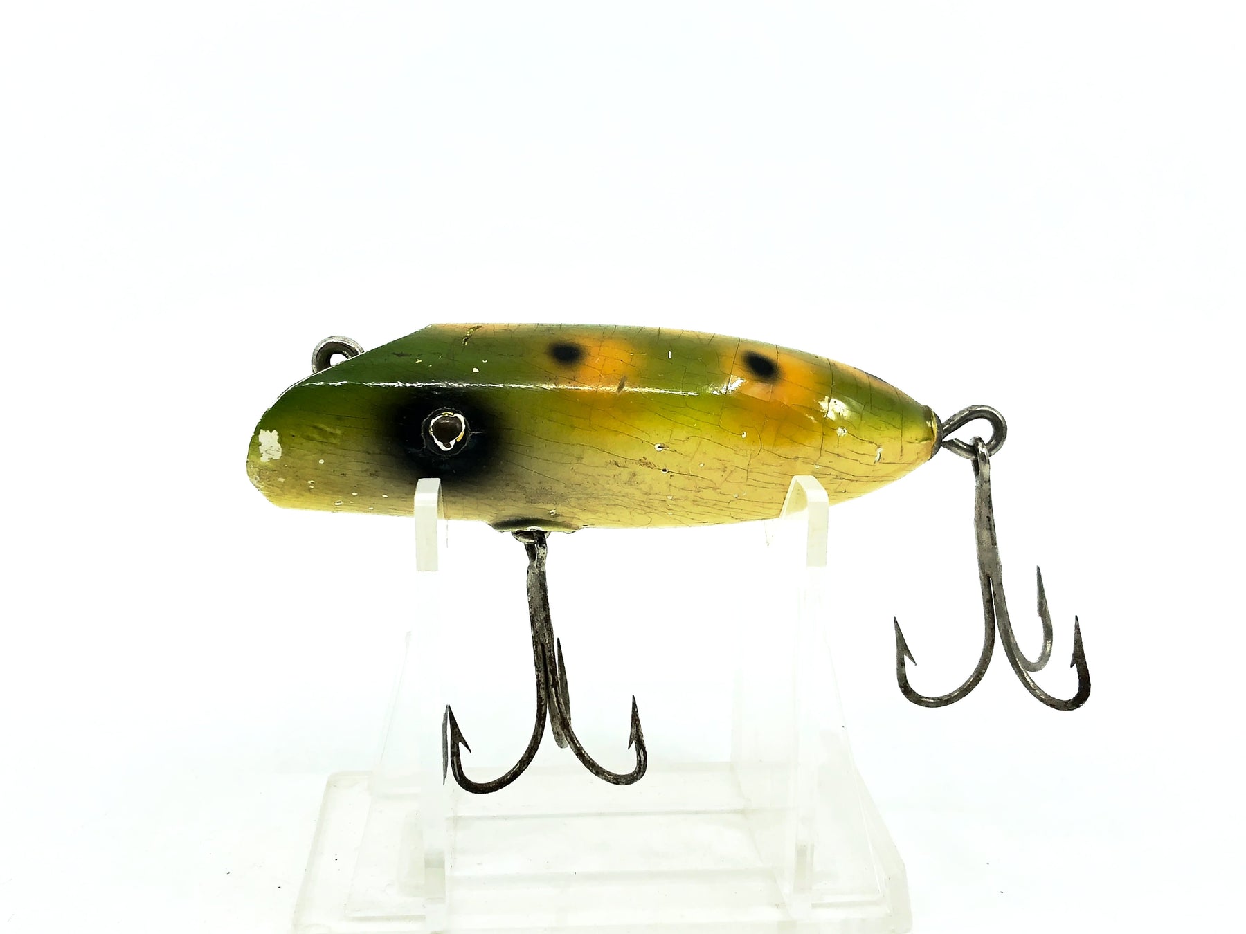 South Bend Babe-Oreno, Frog Color. Great wooden bait here. About 3" long. Lure is used with wear and marks, but overall good condition. Fish or display. One of the all time classic fishing lures. See photos.