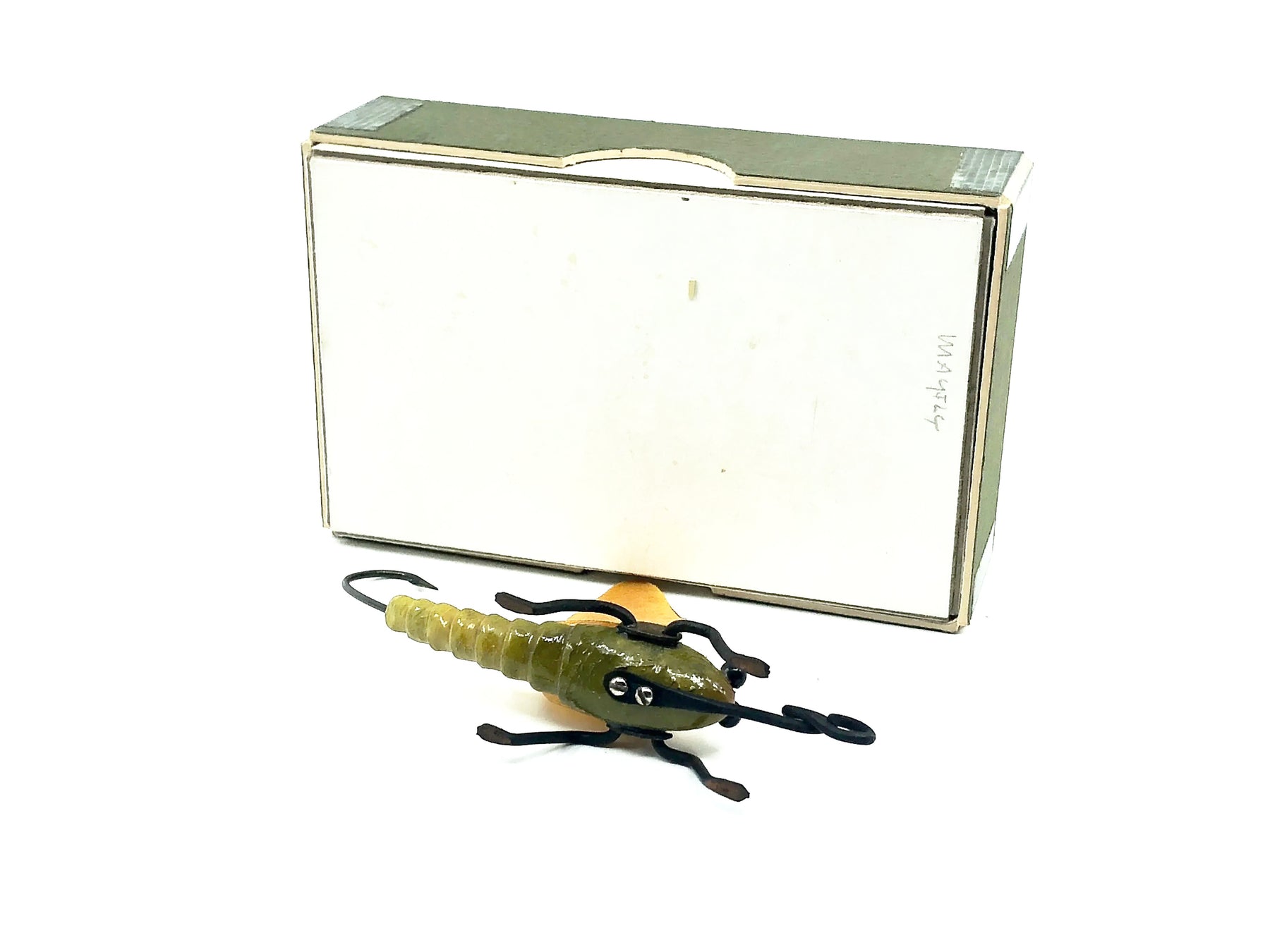 Macatawa Mayfly w/Box. Early Macatawa here and a unique model. About 3 3/4" long including the back hook and front line tie (2 1/8" long body). Wooden lure with metal works and canvas wings. Lure is in amazing shape. The matching box is in great condition as well with just a little minor storage wear. See photos.