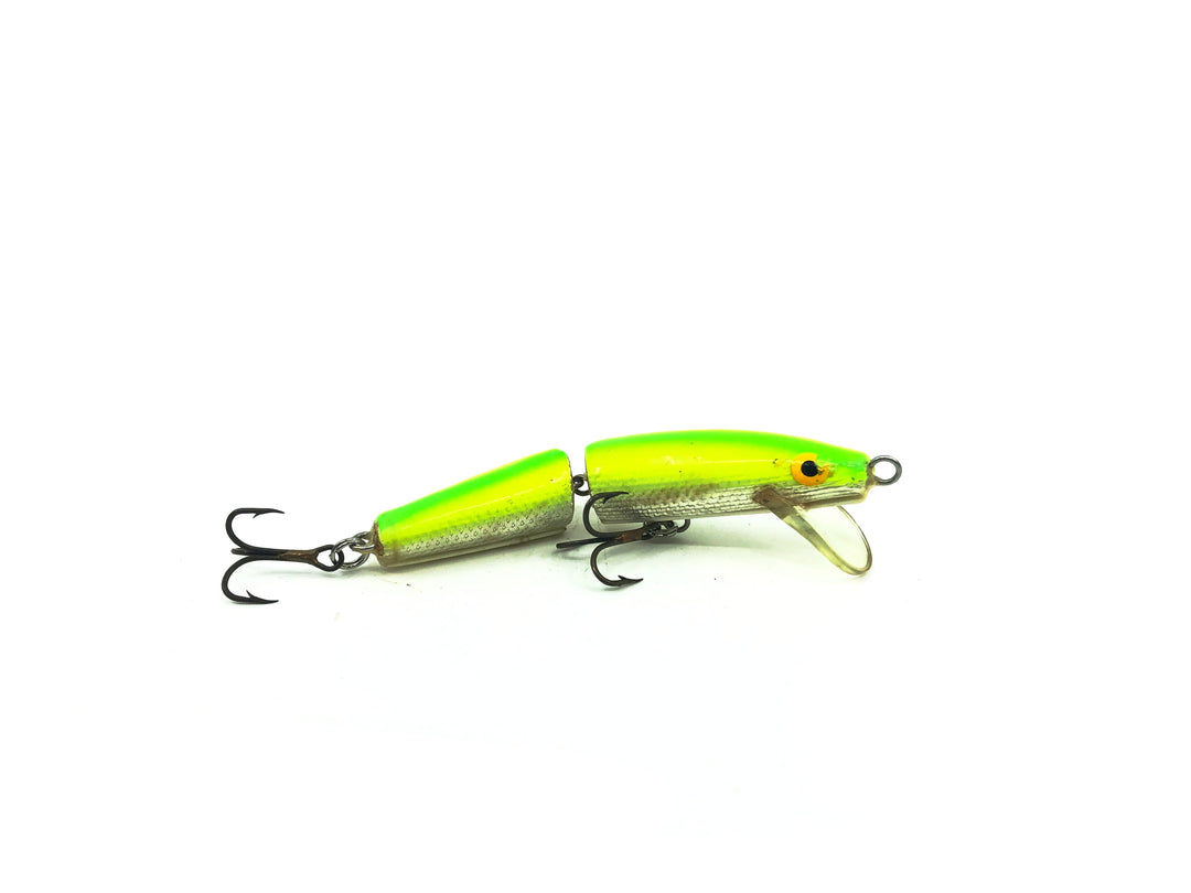 Jointed Floating Minnow, Silver/Charteuse Color. Quality lure for a bargain price. This unmarked lure is an imitation of the classic Rapala Jointed minnow; specifically the J07. About 2 3/4" long. In good condition with minor wear.