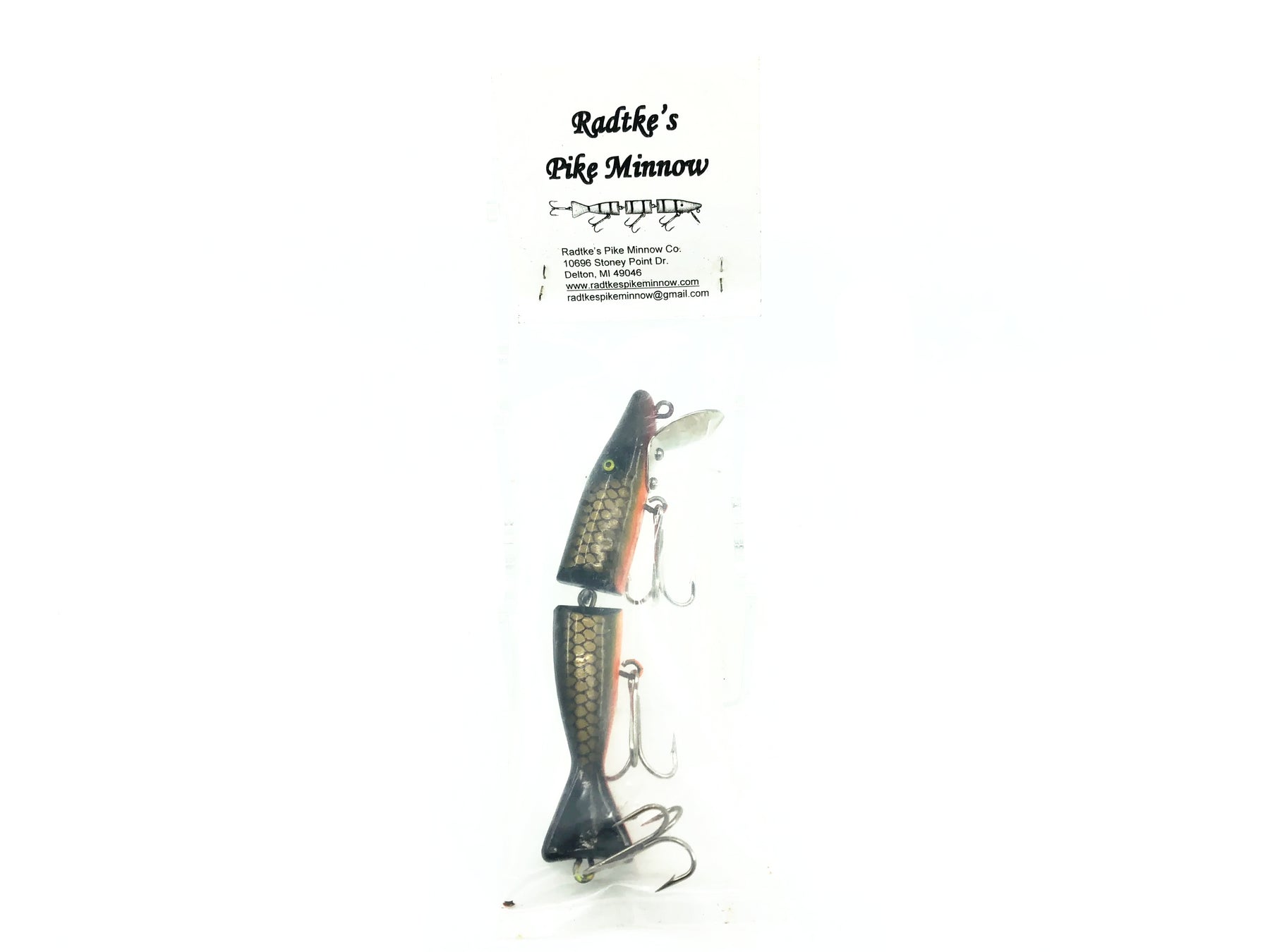Radtke Pike Minnow, Crawdad Color on Card. About 5 1/2" long. Lure is new in packaging and packaging is in good condition. Classic Muskie, Pike, Walleye and Bass lure. See photos. Great lure to fish or collect.