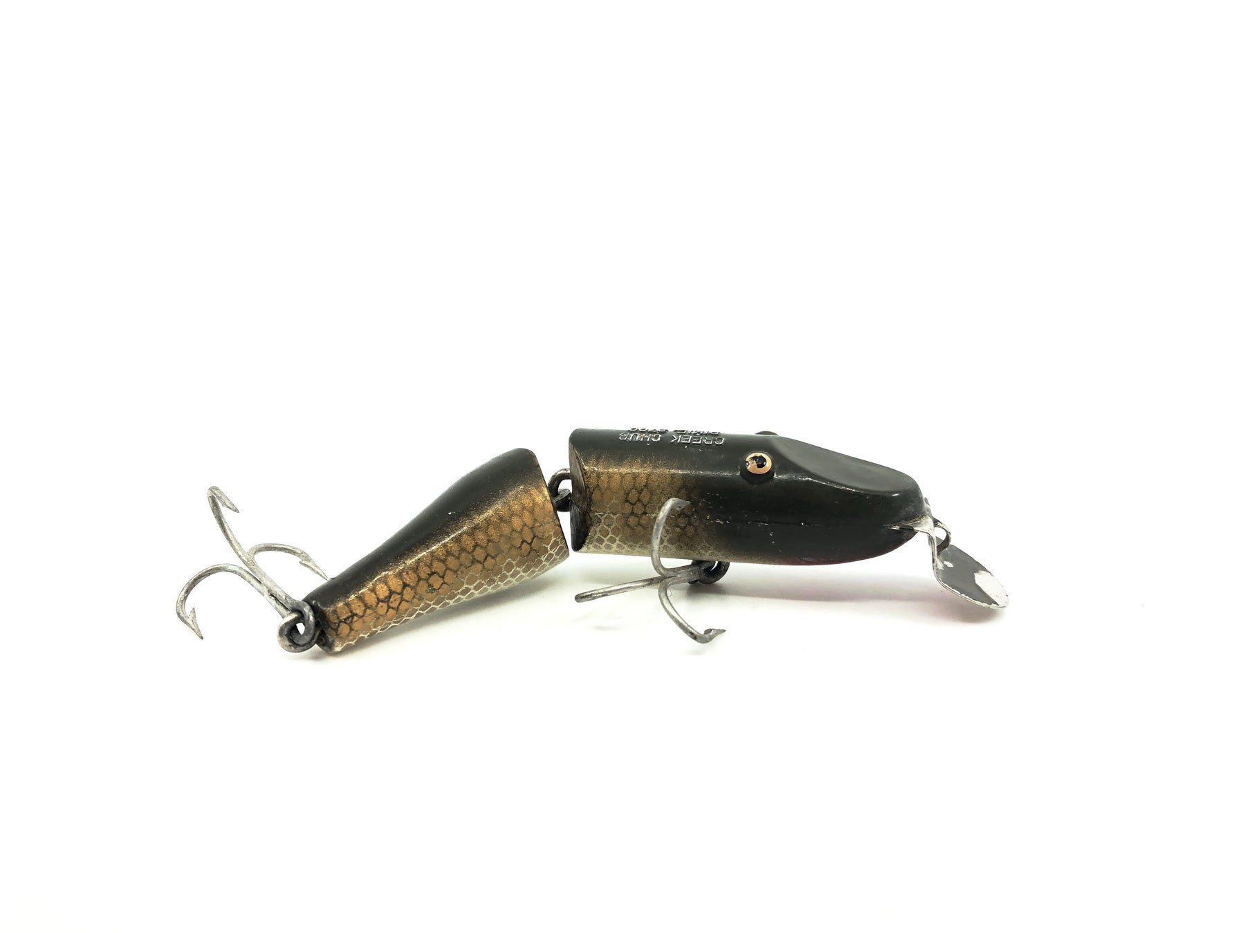 Creek Chub 2700 Baby Jointed Pikie Minnow in Pikie Color. About 3 1/2" long. Vintage plastic Creek Chub. Used with some wear but in overall good condition, see photos. Collect or fish this great vintage lure.