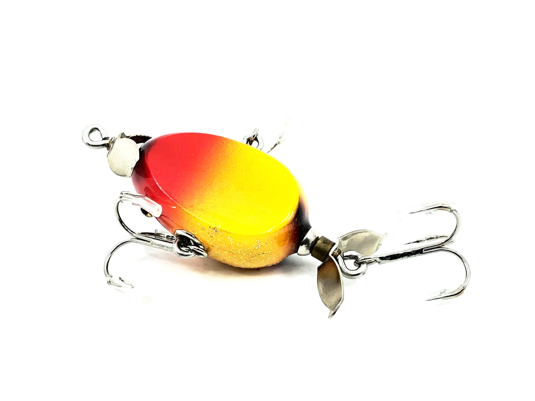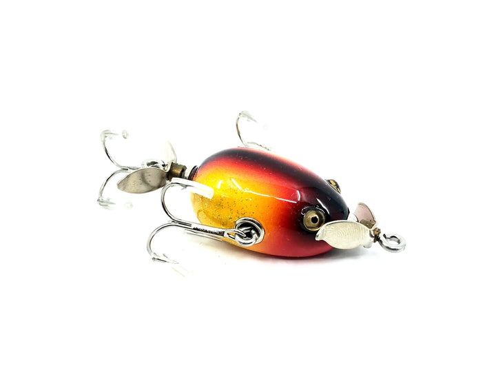 Musky Dan (XXX Lures) Baby Kent Frog, Red/Yellow Flitter Color. Musky Dan lure inspired by a classic vintage lure. Lure body is about 1 3/4" long (just the body). Wooden lure, glass eyes. Lure is in new like condition, see photos. This bait has been sitting in a collection for the past decade. Fish or collect.