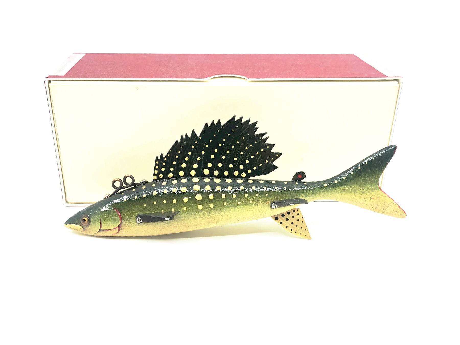 Macatawa Bait Co. Yellow Spotted Grayling Decoy w/Box. This decoy comes with metal fins. Lure is about 7 1/2" long overall. Wooden lure, glass eyes. Decoy is in amazing shape. The matching box does have some minor storage wear but is in overall good condition. This bait has been sitting in a collection for quite a few years. See photos.