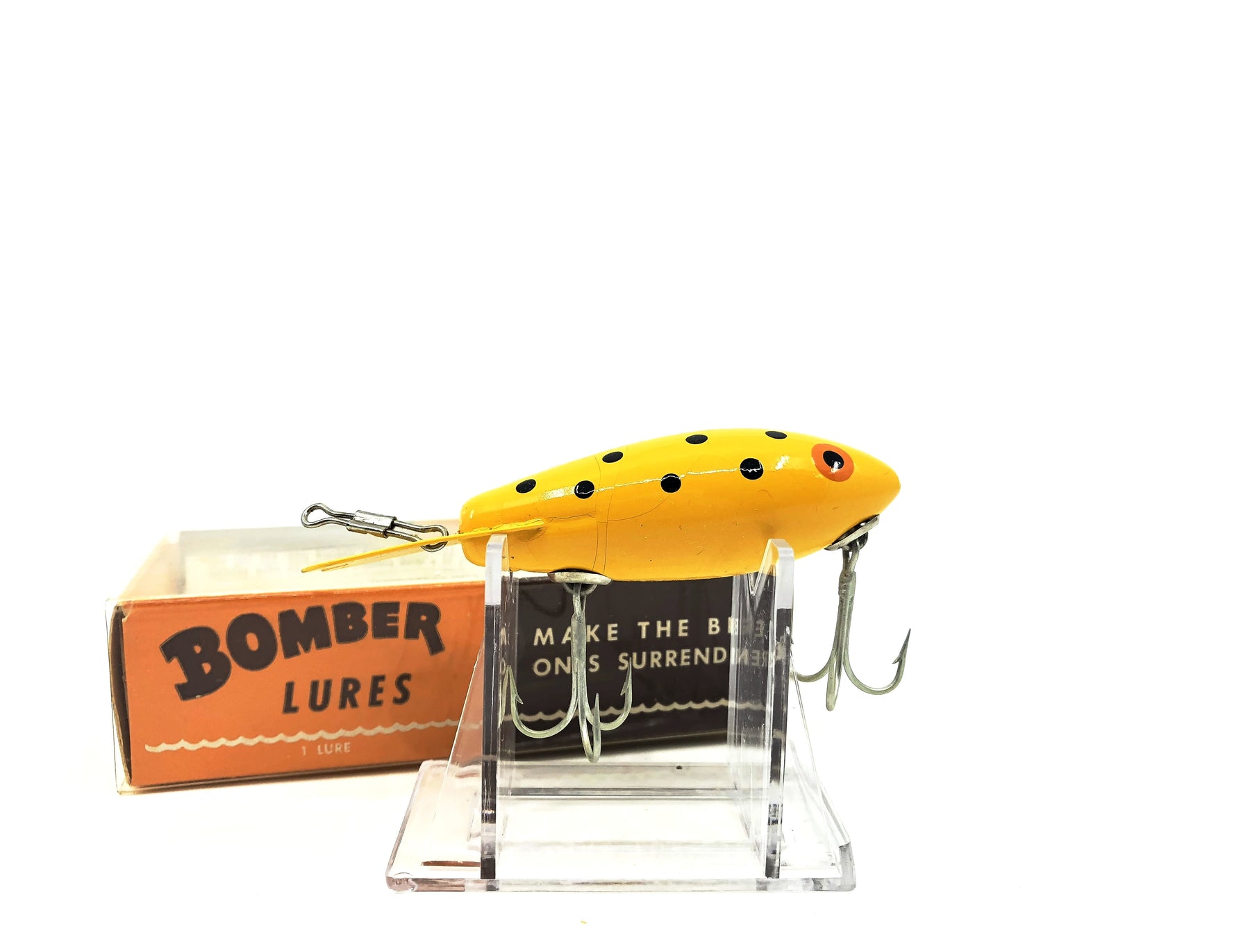 Wooden Bomber 500 Series 539 Yellow Black Spots Color with Box. At about 3 1/2" long this lure is in very good condition with only a few small marks. The box is correctly marked and in great condition. Great addition to anyone's collection or tackle box. See photos.