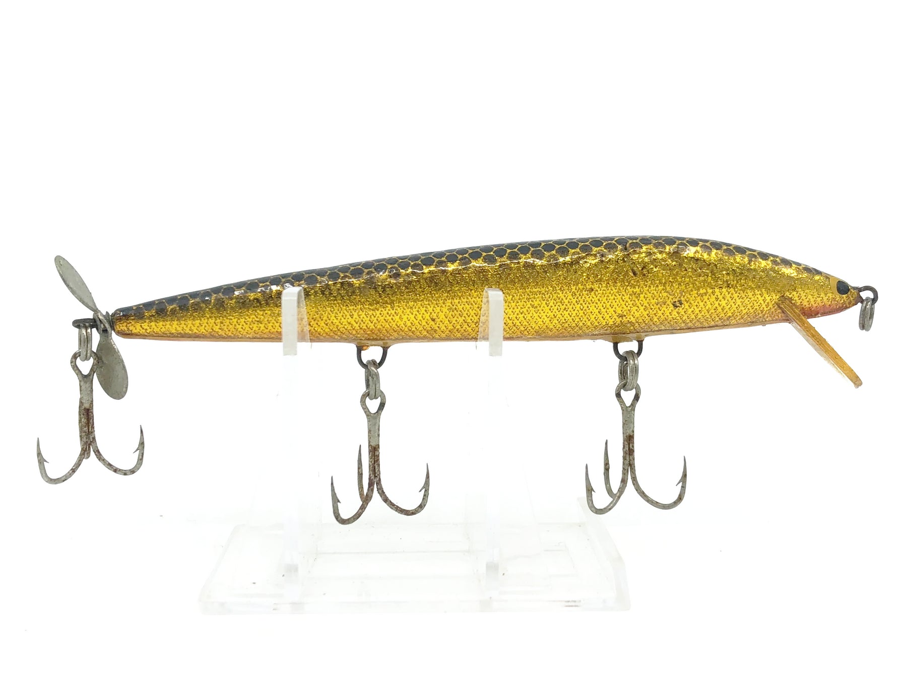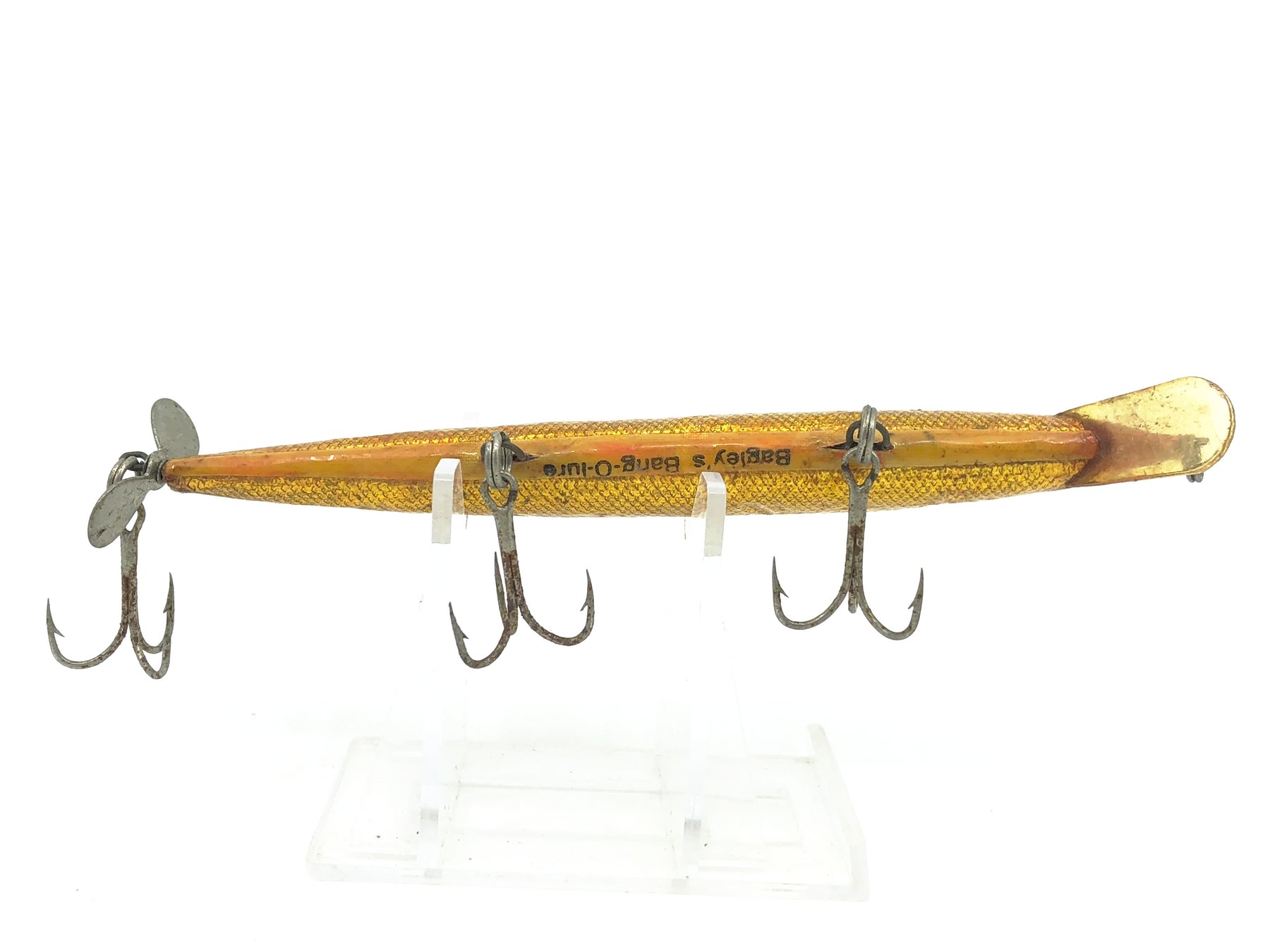 Bagley Bang-O-Lure 5 Spintail, BG Black on Gold Foil Color. Very old Bang-O-Lure. About 5" long lure. Used vintage lure with some wear and marks but in overall good shape, see photos. Great vintage Bagley!