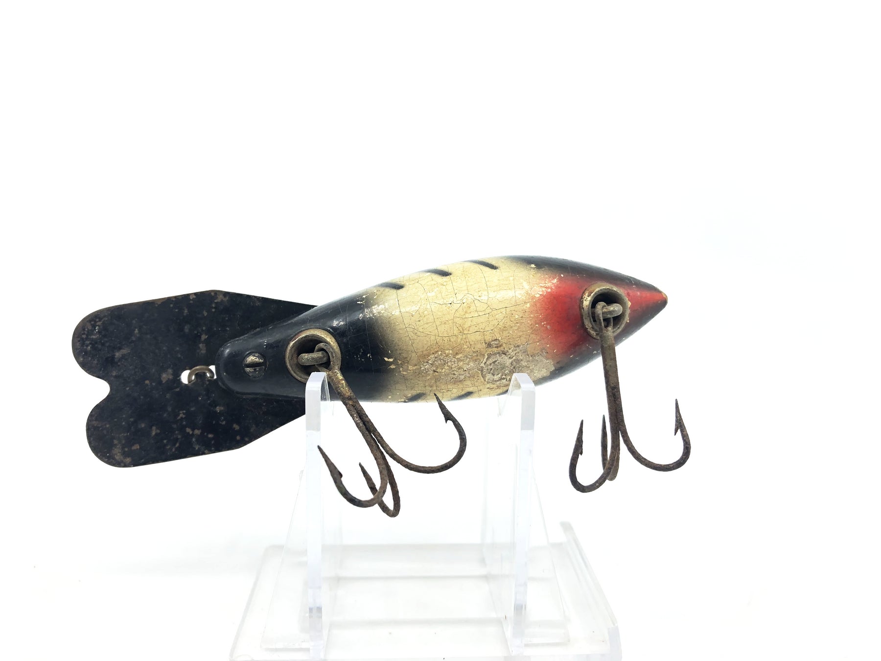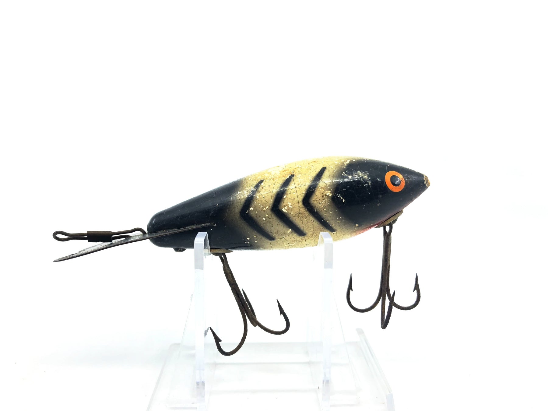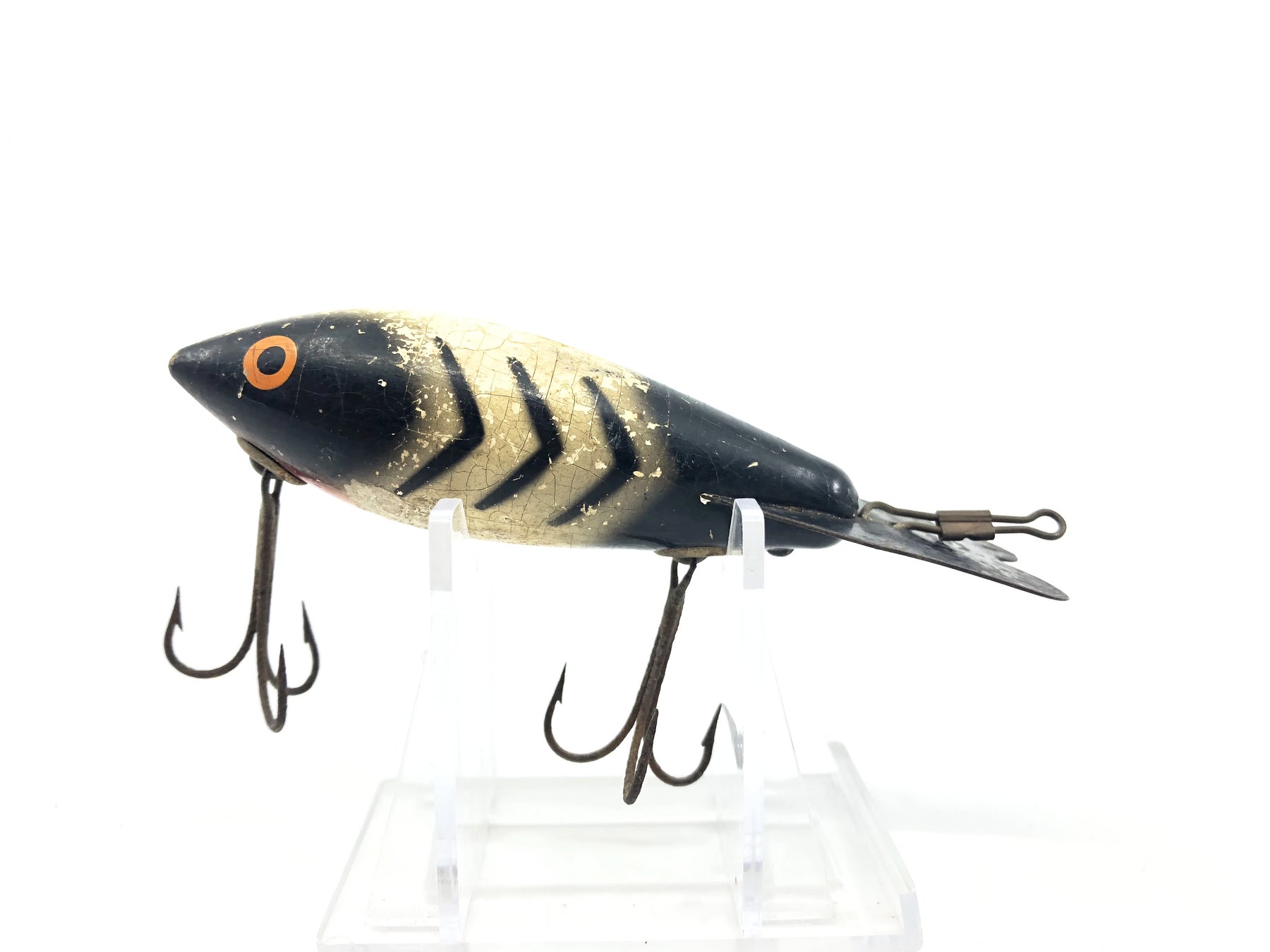 Wooden Bomber 600 Series 606 White/Black Ribs. At about 4" long this larger Bomber is in ok condition with some marks and signs of wear. Classic lure that isn't made anymore in a unique color. See photos.