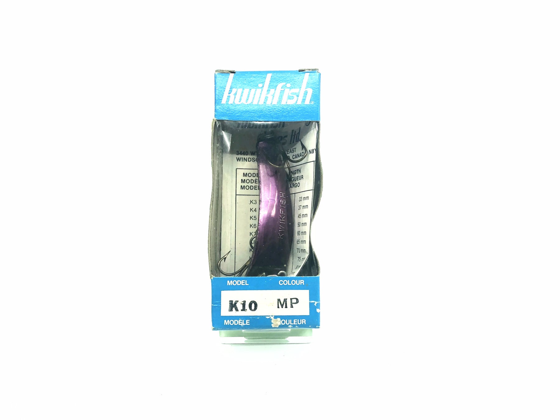 Pre Luhr-Jensen Kwikfish K10 MP Metallic Purple Color New in Box Old Stock. Pre Luhr-Jensen and Pre Rapala. The K10 is listed as 3" long and weighing 7 grams. New old stock here. Box in nice shape aside from some minor wear and dents, lure has some wear and marks, see photos. Cast or troll. Awesome lure for fishing, especially muskies, big pike, bass and walleye and very tough to find. Grab this one while you can. Collect or fish.