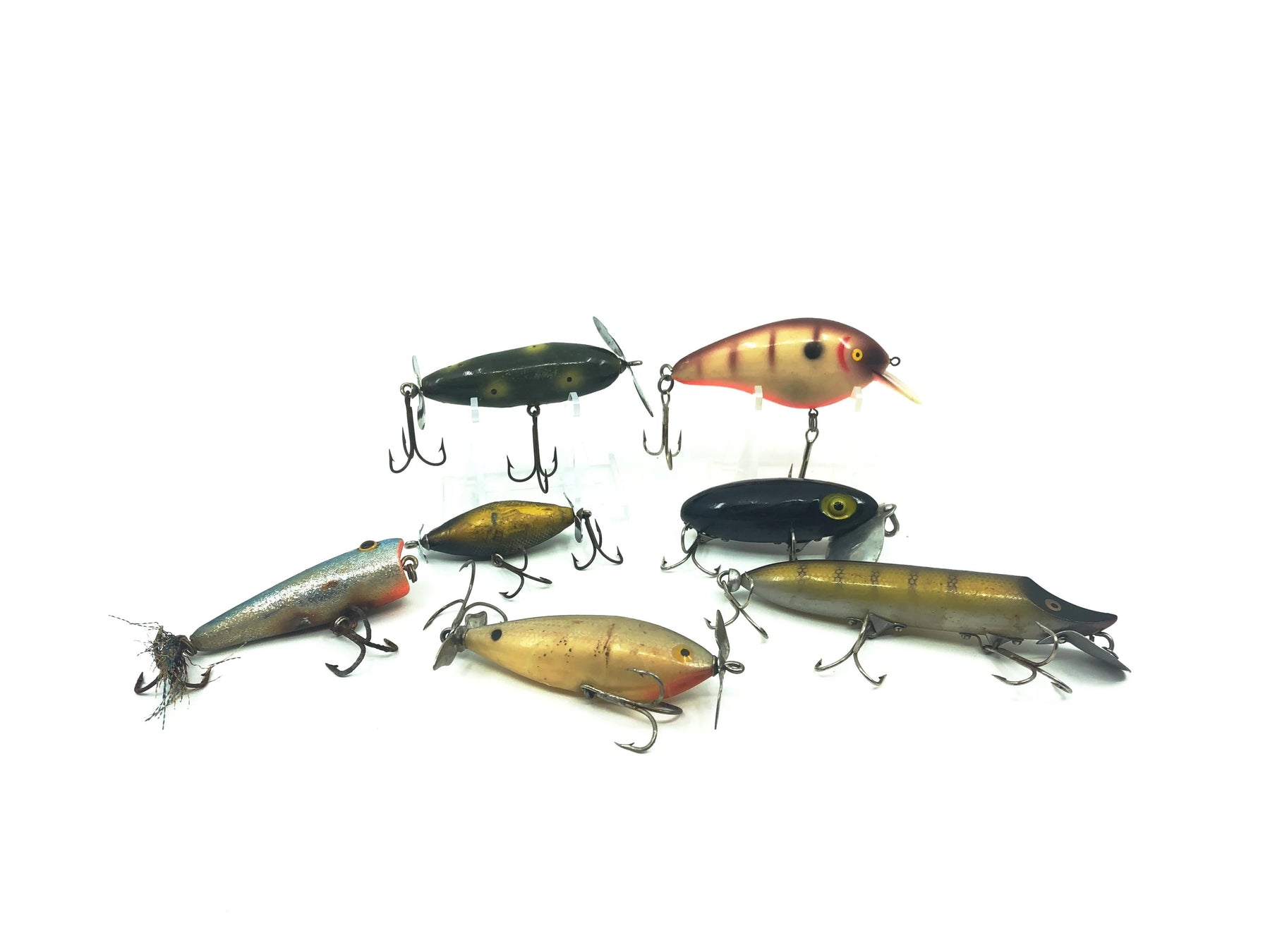 Imitation Lure Pack. This pack includes 7 lures that appear to be imitation of various different lures. From jitterbug type lure to vamps, this pack is the perfect buy for any fishermen. See photos.  Lures are used with varying degrees of wear but still decent for fishing or display.