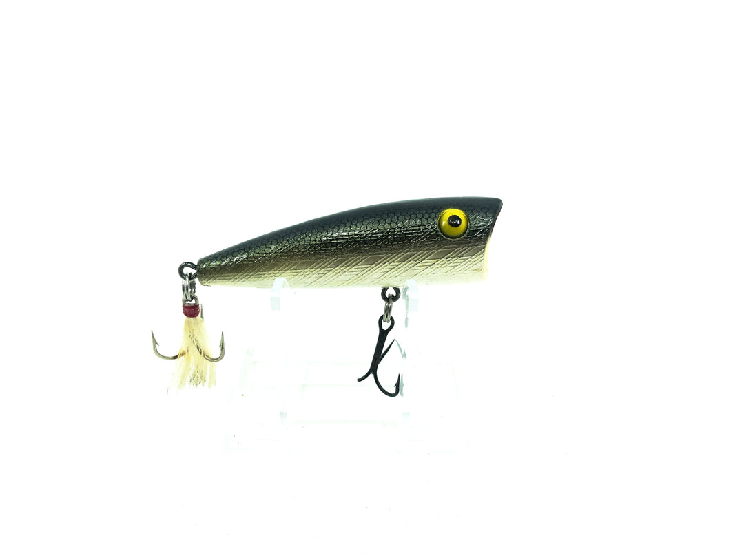 Rebel Magnum Pop-R Tennessee Shad Color. This large pop-r is about 3" long. Lure is in ok condition with some wear and a broken barb. Great lure that provides plenty of action. See photos.