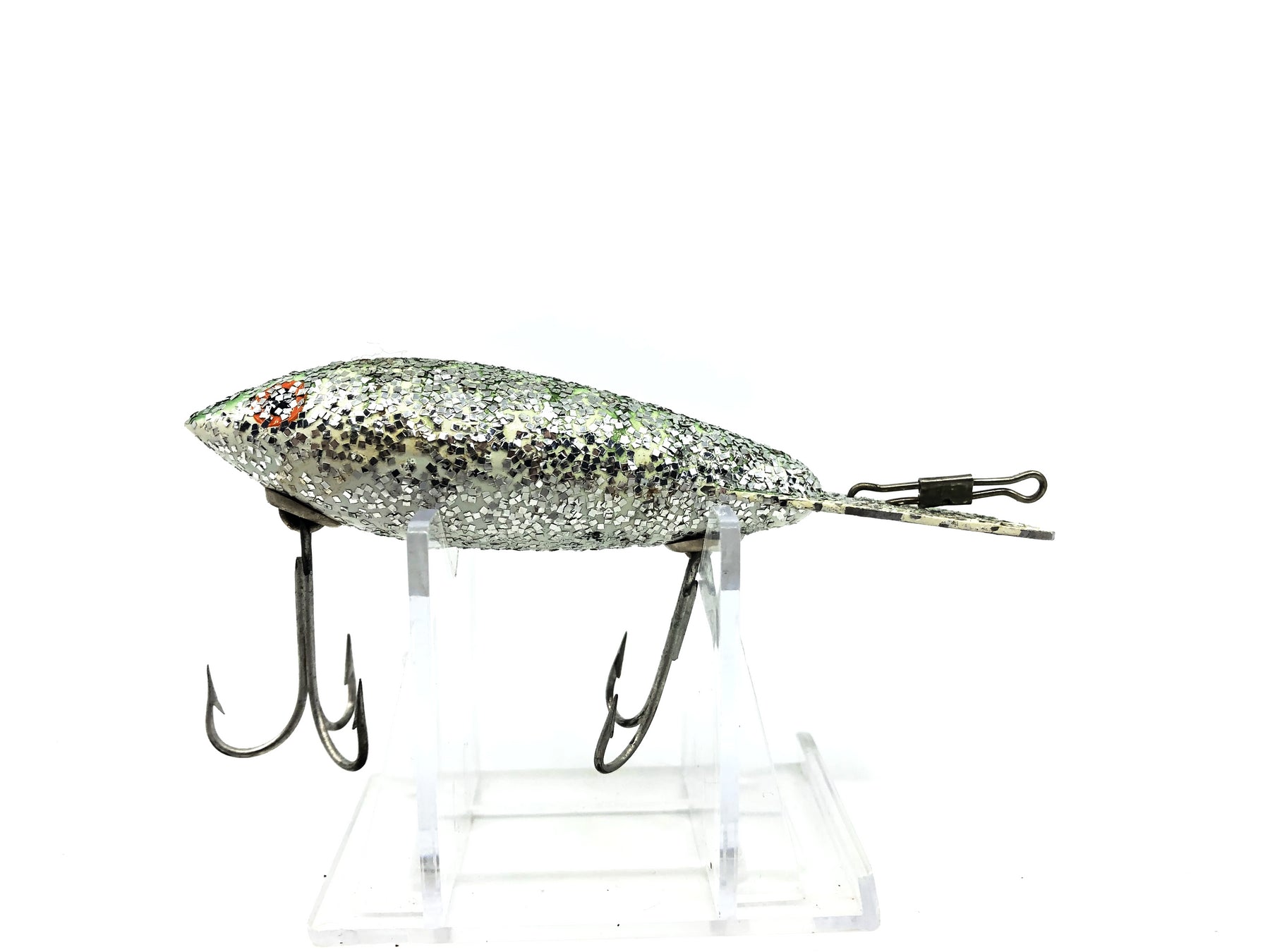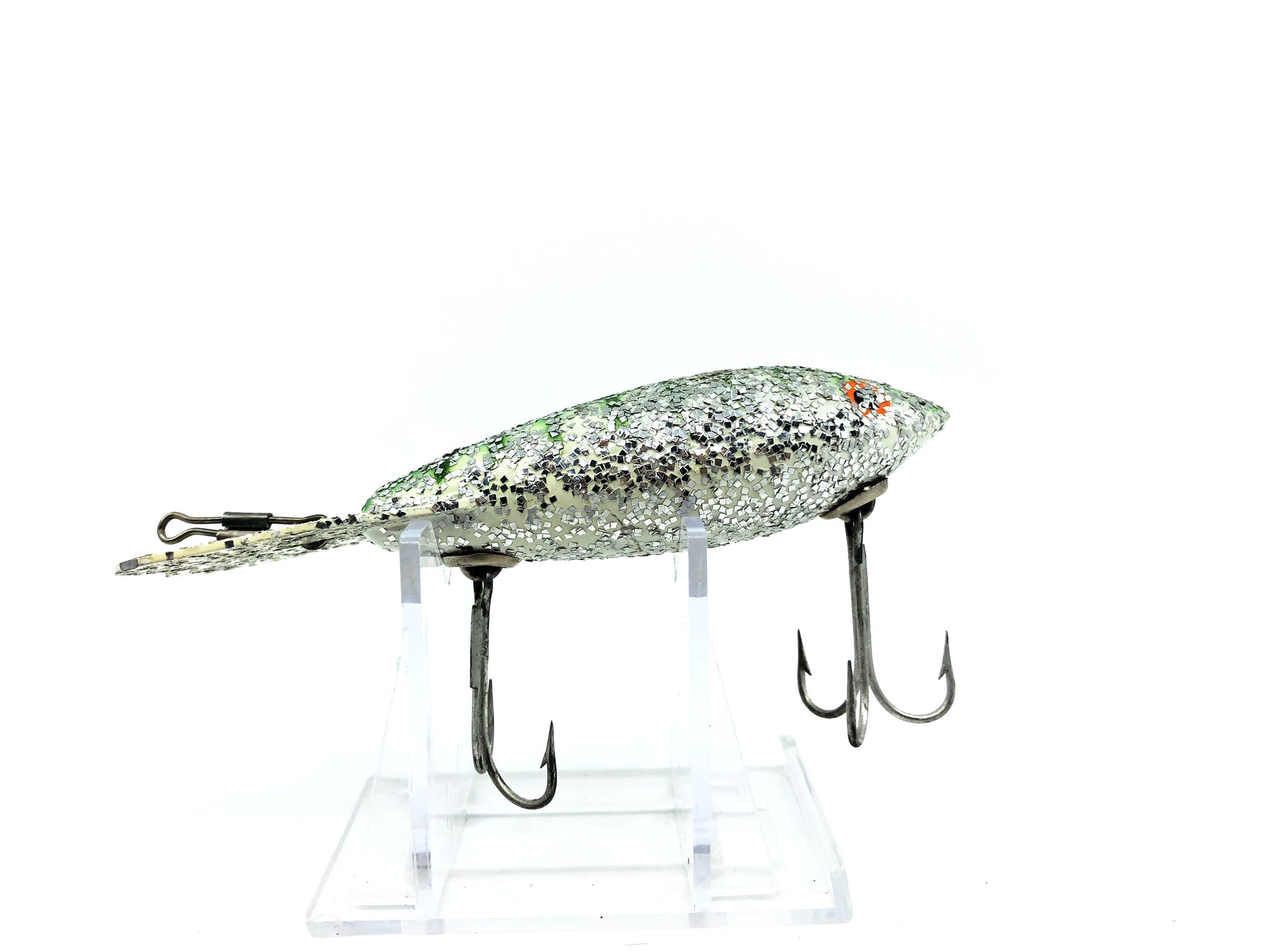 Bomber 600 Series 615 Christmas Tree Color. Very hard color to find in plastic. At about 4" long this larger Bomber is in very good condition with little signs of wear aside from a broken/clipped hook. Classic lure that isn't made anymore in a one of Bombers most iconic colors. See photos.