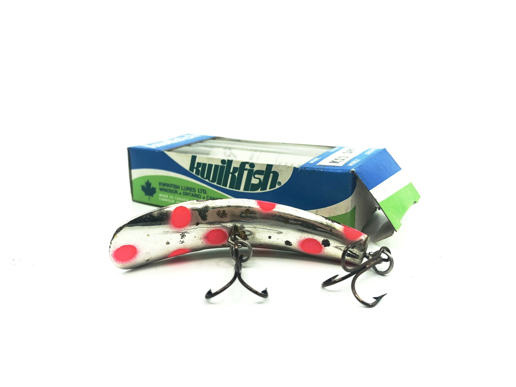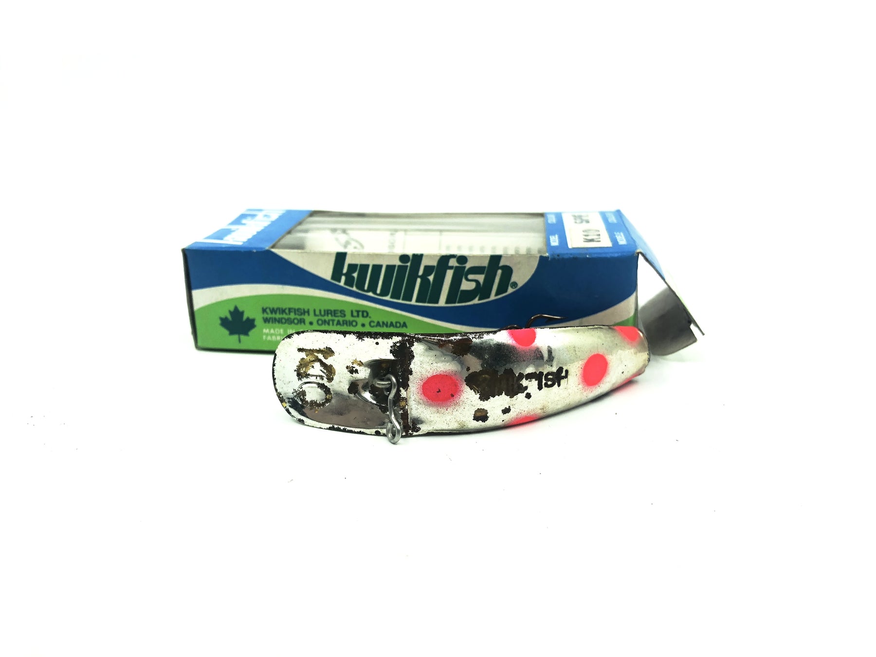 Pre Luhr-Jensen Kwikfish K10 SPF Silver Plated Red Fluorescent Spots Color New in Box Old Stock. Pre Luhr-Jensen and Pre Rapala. The K10 is listed as 3" long and weighing 7 grams. New old stock here. Box in nice shape, however the lure has a good amount of wear and marks, see photos. Cast or troll. Awesome lure for fishing, especially muskies, big pike, bass and walleye and very tough to find. Grab this one while you can. Collect or fish.